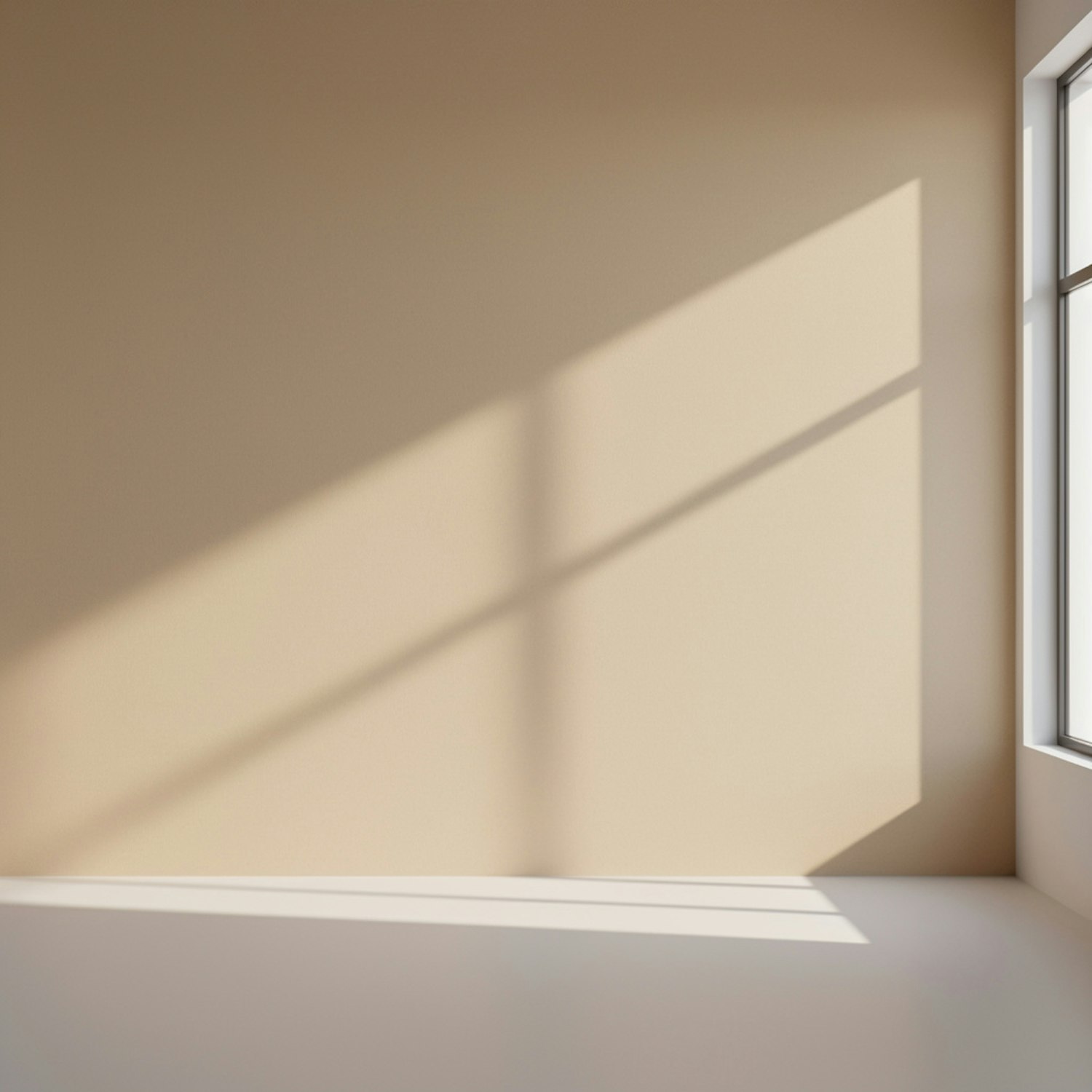 Minimalist interior with sunlight casting soft shadows on a beige wall, creating a serene and modern atmosphere.