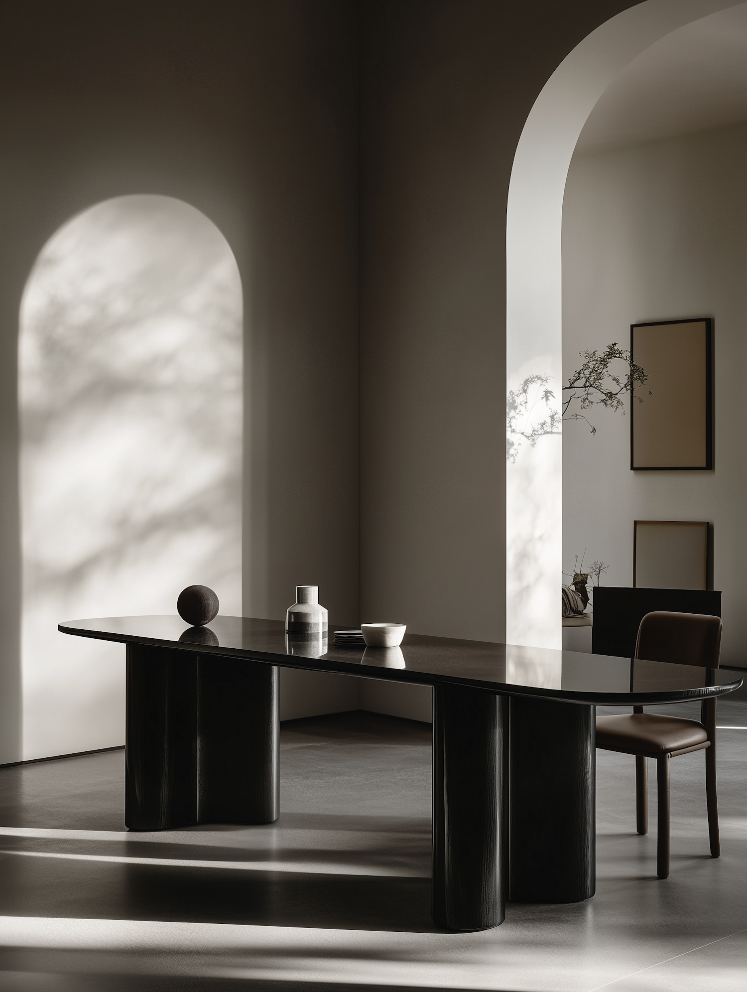 Minimalist interior with a sleek black table, leather chair, and soft natural light casting shadows through an arched opening.
