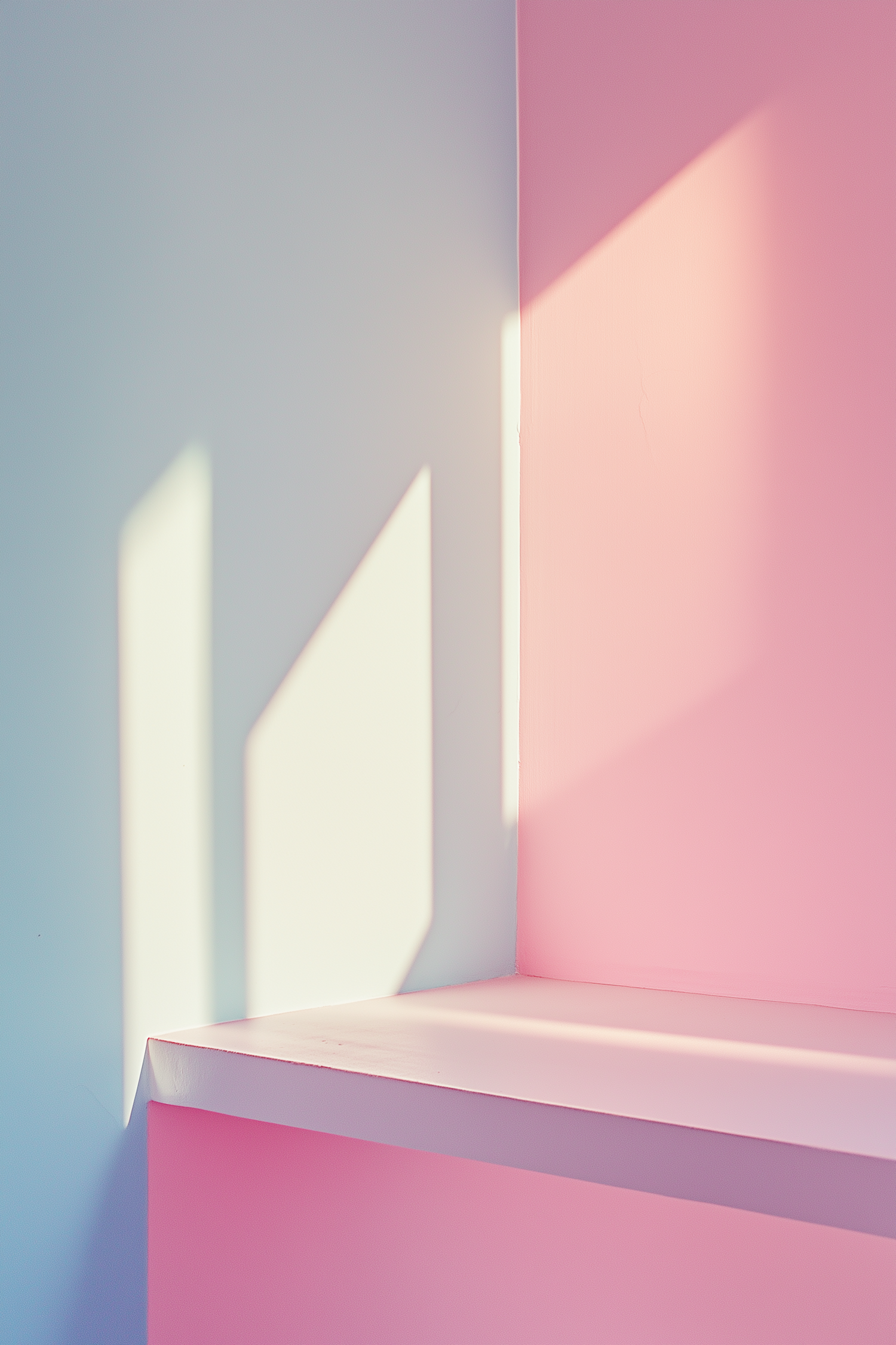 Minimalist pastel interior with soft pink and blue walls, sunlight casting geometric shadows for a serene and modern aesthetic.