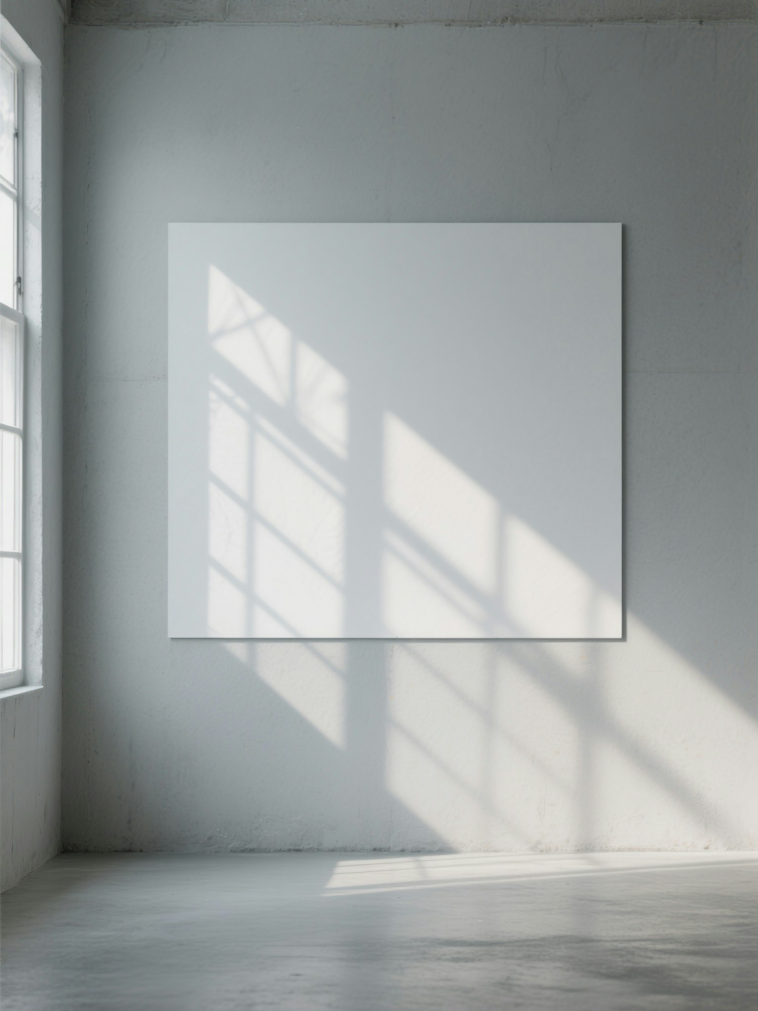Minimalist room with a blank white canvas on a gray wall, sunlight casting geometric shadows through a large window. Modern and serene.