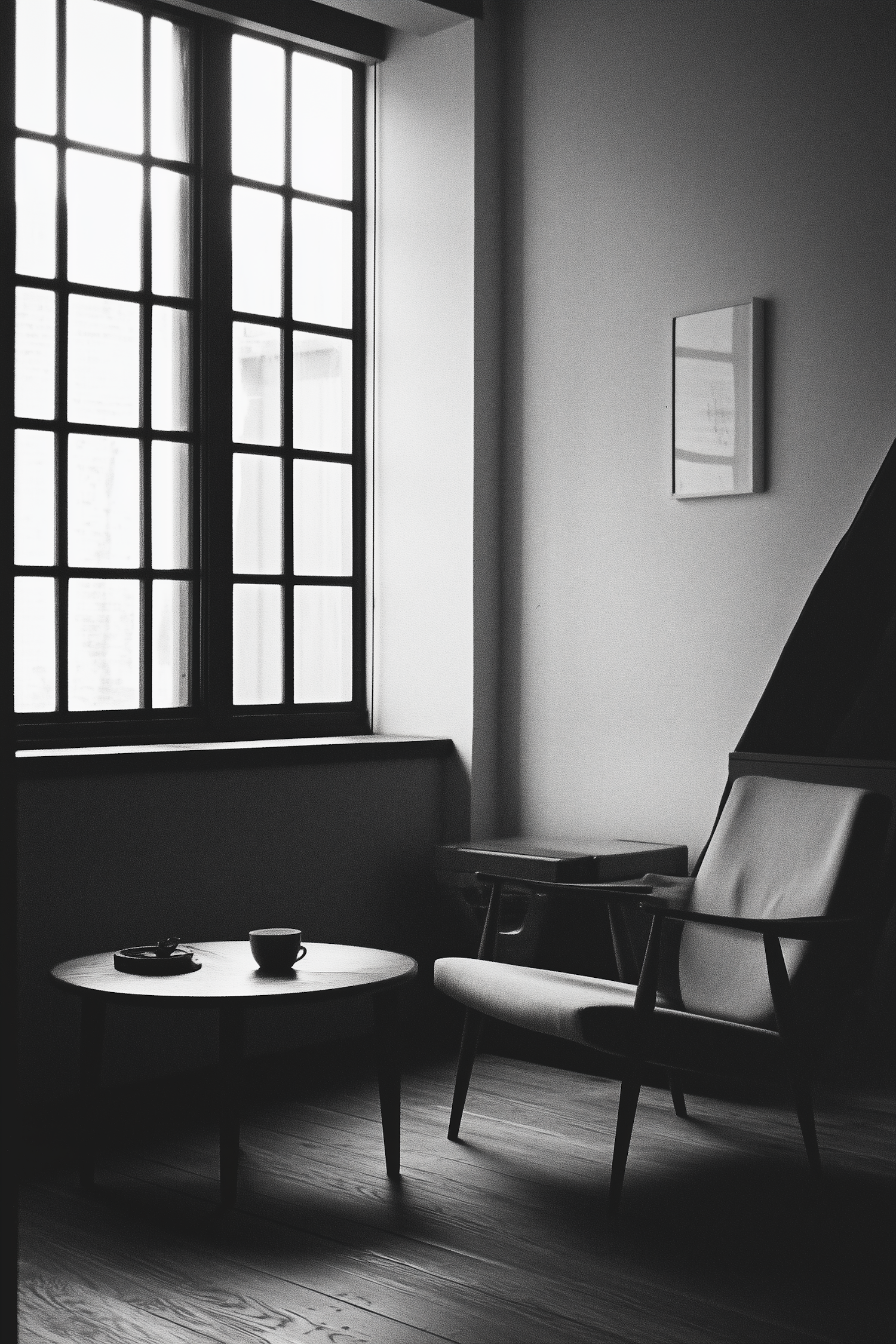 Minimalist room with modern armchair, round coffee table, and large windows. Soft lighting creates a serene atmosphere.