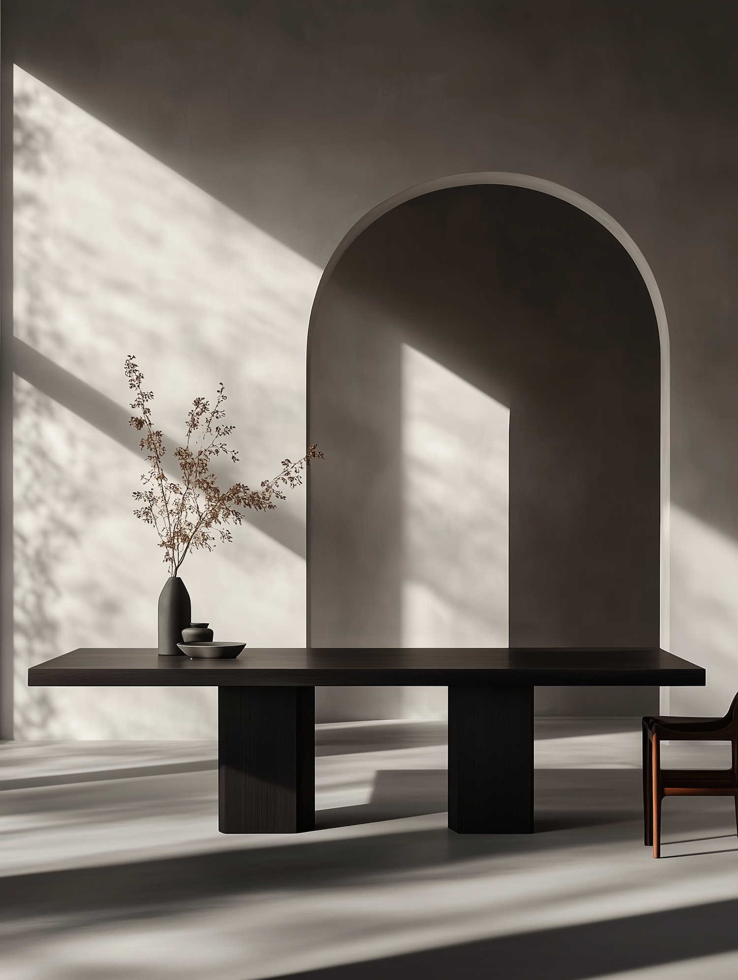 Minimalist interior with a dark wooden table, black vase, dried branches, and arched wall opening bathed in soft sunlight.