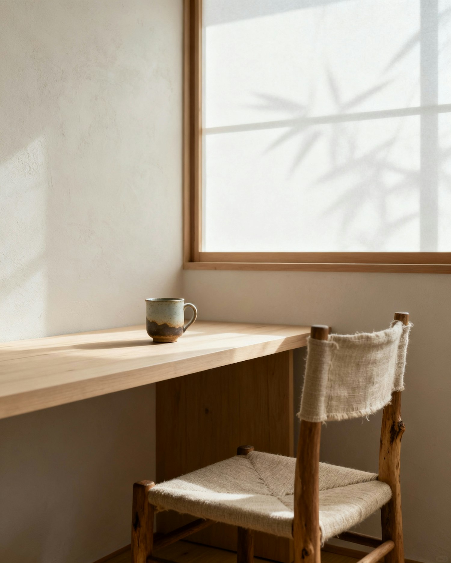 Minimal japanese interior design, wabi-sabi and japandi atmosphere, soft natural daylight, calm and quiet mood, realistic photography, subtle depth of field, balanced composition, minimal styling, handcrafted furniture, natural imperfections, organic forms, slow living aesthetic, editorial interior photography style A minimalist japanese workspace with a low wooden desk in pale wood, a floor chair in raw linen and wood, a handmade ceramic mug, smooth plaster wall, rice paper window diffusing the daylight
