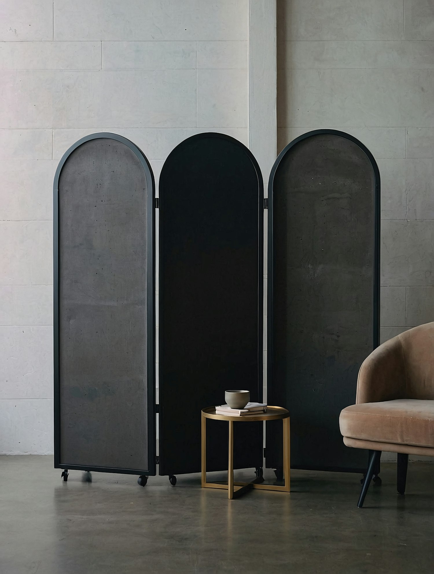 Modern interior with a dark arched room divider, beige velvet chair, gold side table, and neutral decor against a light gray tiled wall.