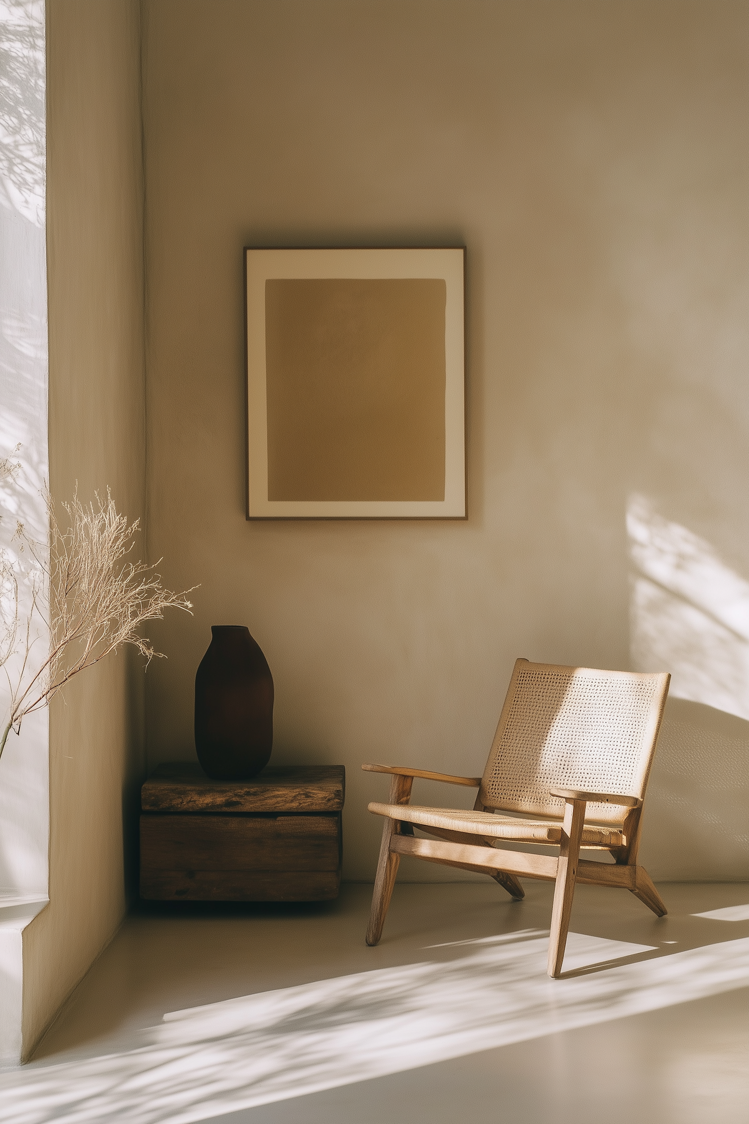 Minimalist interior with a wooden chair, rustic side table, abstract art, and soft natural light creating a serene atmosphere.