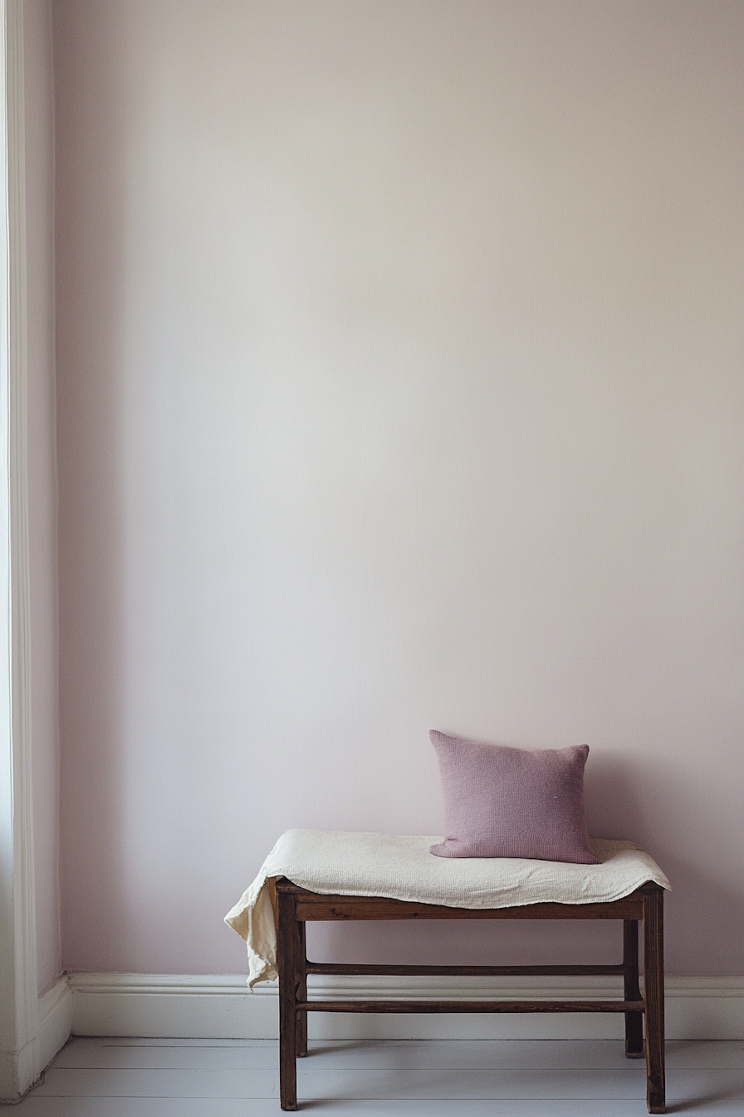 Minimalist wooden bench with a lavender pillow against a pastel pink wall, draped with beige fabric. Soft natural light enhances the cozy vibe.