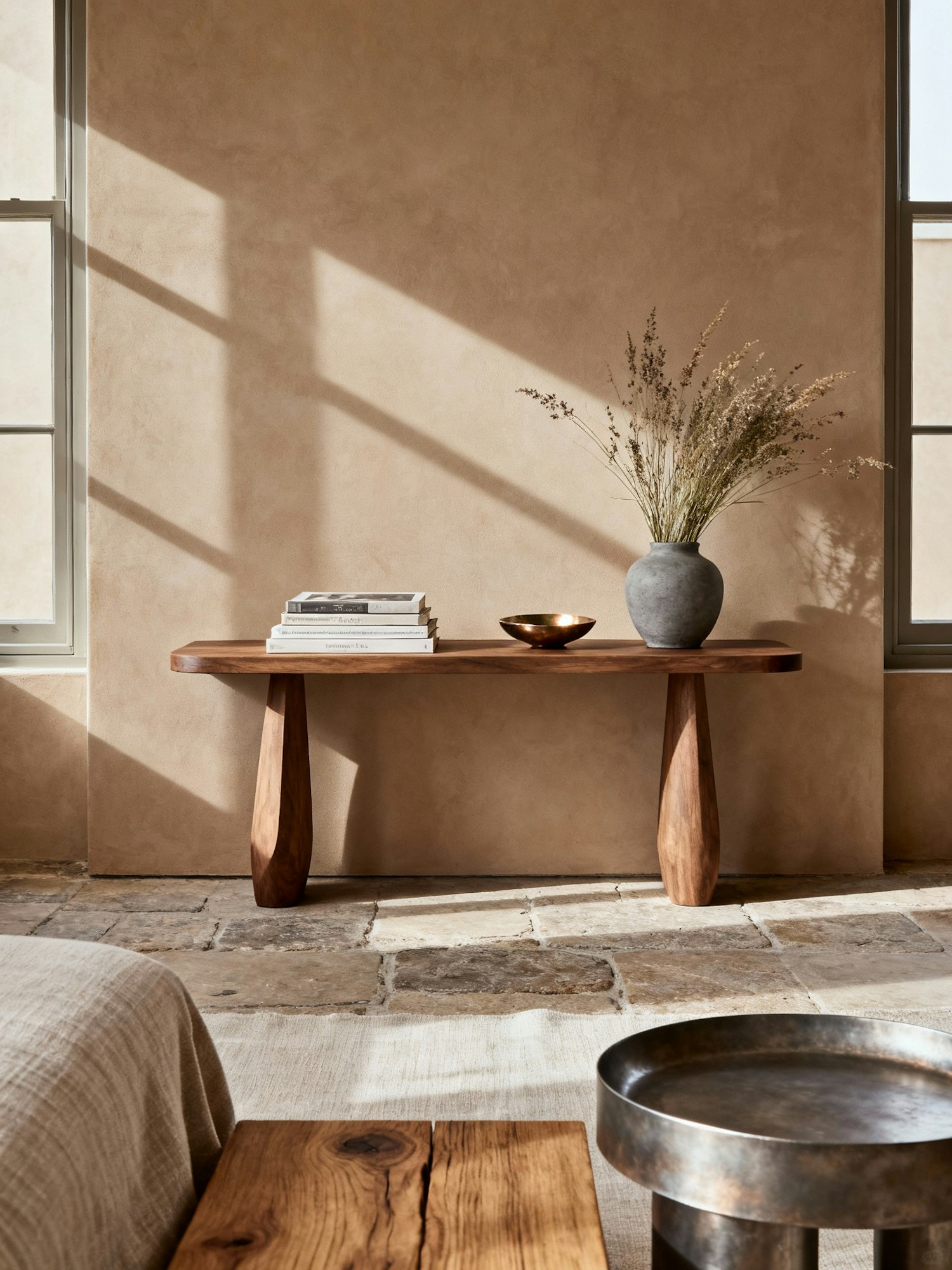 Nordic interior photography, shot in natural daylight — serene and contemplative atmosphere. Soft diffused light from side windows, gentle shadows, warm neutral palette with tones of beige, tan, and muted brown. Use raw and tactile materials like oak wood, linen, stone, brushed metal. Minimal composition with air and negative space. Realistic photo with subtle grain, no overexposure. Architectural framing, calm and timeless design aesthetic inspired by FRAMA — quiet luxury, Scandinavian minimalism, sensory stillness. A wooden console table with sculptural, minimal legs, set against a wall painted in a muted clay tone. On its surface, a balanced arrangement of neutral-toned objects: stacked art books, a grey ceramic vase with dried meadow branches, and a small bronze dish reflecting soft light. In the background, part of a stone floor and shadow from a window frame add depth. The air feels still, like a room frozen in quiet morning light.