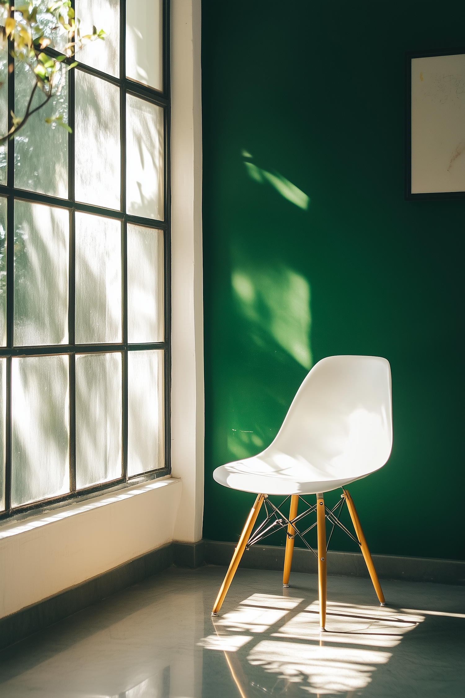 A modern white chair with wooden legs sits by a green wall and large window, bathed in sunlight and soft shadows for a cozy vibe.