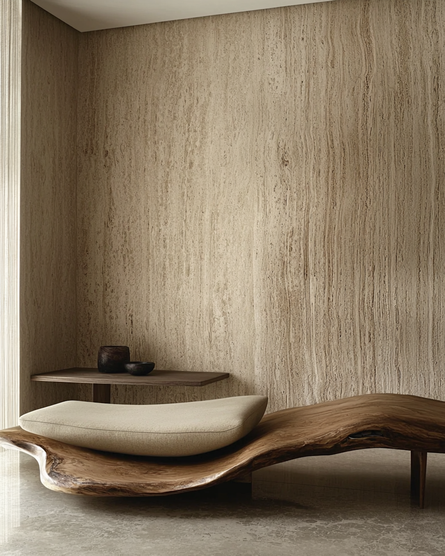 Minimalist room with a sculptural wooden chaise lounge, beige cushion, textured wall, and rustic decor for a serene, modern vibe.