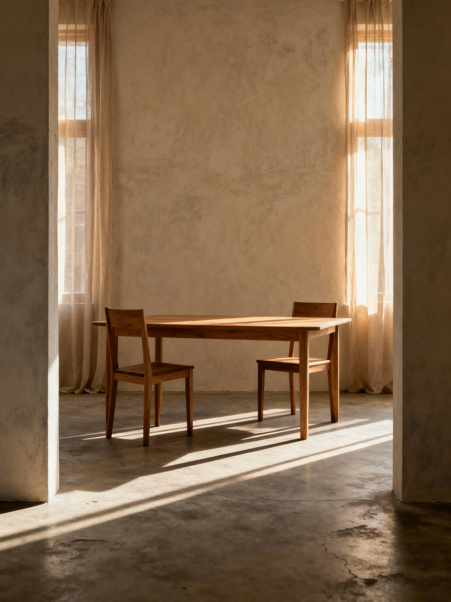 Nordic interior photography, shot in natural daylight — serene and contemplative atmosphere. Soft diffused light from side windows, gentle shadows, warm neutral palette with tones of beige, tan, and muted brown. Use raw and tactile materials like oak wood, linen, stone, brushed metal. Minimal composition with air and negative space. Realistic photo with subtle grain, no overexposure. Architectural framing, calm and timeless design aesthetic inspired by FRAMA — quiet luxury, Scandinavian minimalism, sensory stillness. Two wooden dining chairs positioned symmetrically around an empty table, their straight lines emphasizing balance and form. Behind them, a sheer curtain diffuses warm afternoon sunlight. The room’s floor is matte concrete with a slightly uneven tone, and the wall has a chalky, tactile finish. The image feels architectural yet intimate — a space for thought and stillness.