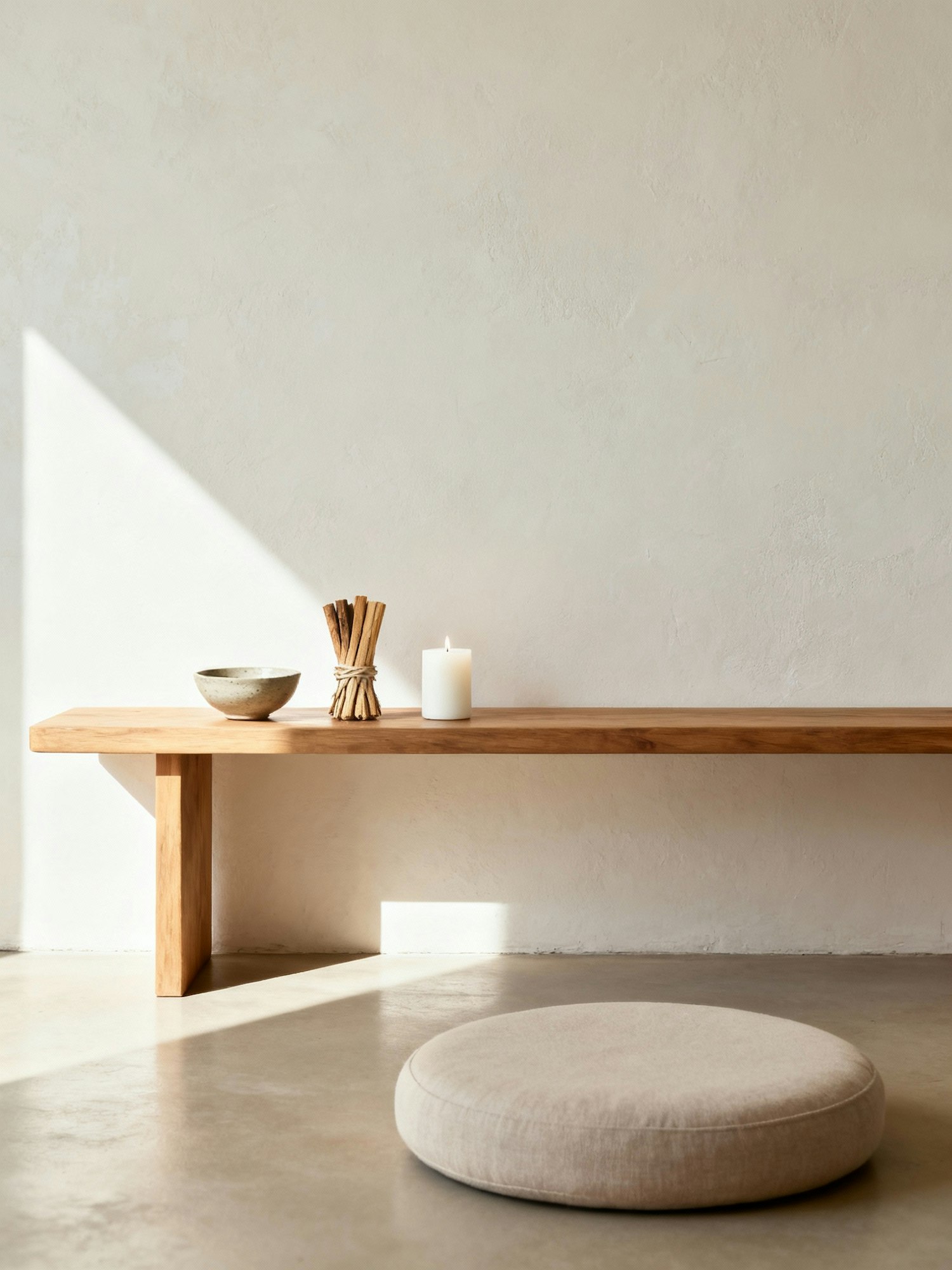 Calm wellness vignette in a light, airy room, low wooden bench against an off-white plaster wall, on it a small ceramic bowl, palo santo bundle, and a single white candle; round meditation cushion on the floor in front, sunlight from camera-left making a soft, warm patch on the wall, background uncluttered to keep focus on the ritual objects. 35 mm, f/4, ISO 100, 1/160 s; exposure gentle. Negative: dark corners, mixed light temperatures, branded items.