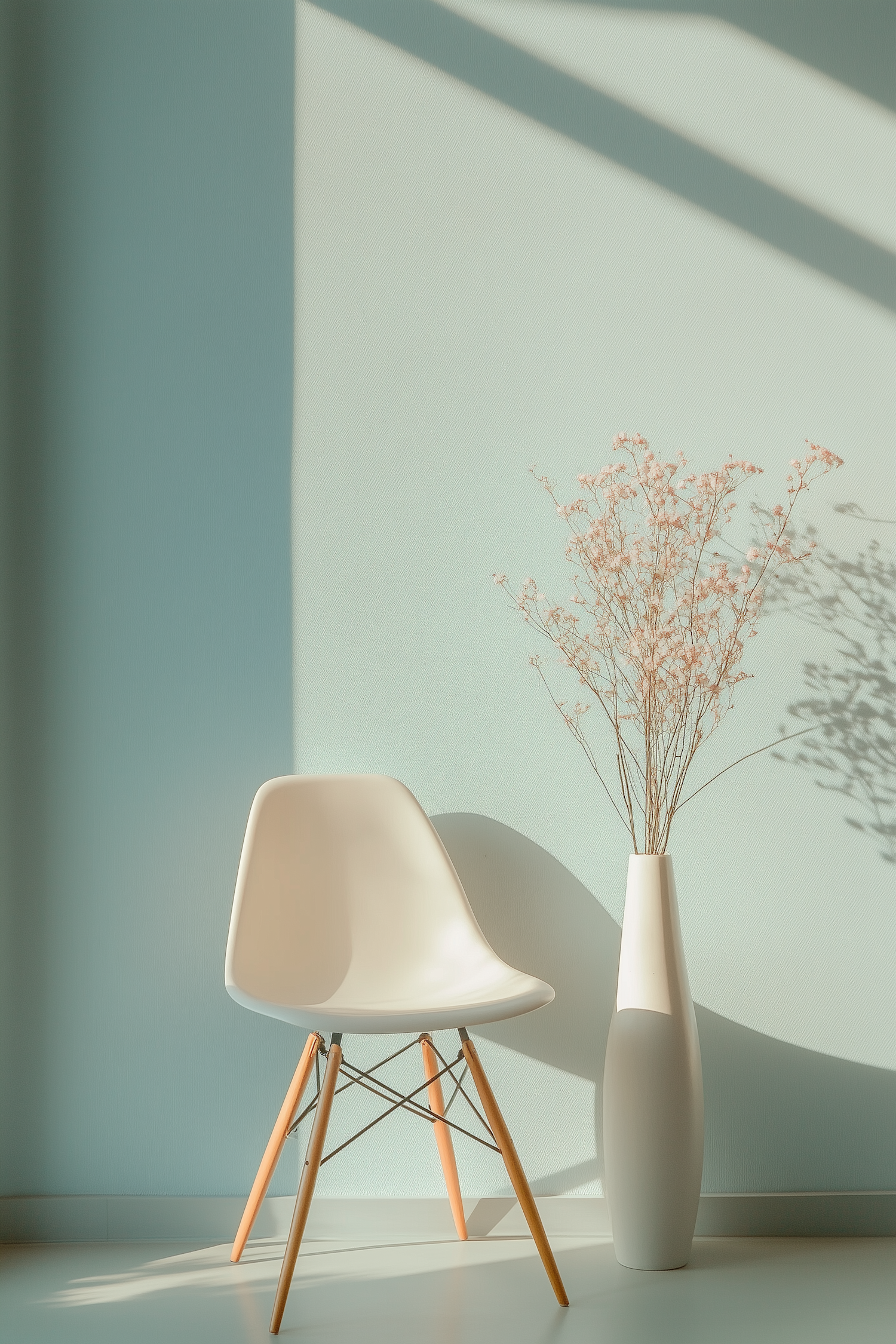 Minimalist interior with a white chair, wooden legs, and a tall vase of dried flowers against a pastel mint green wall in soft sunlight.