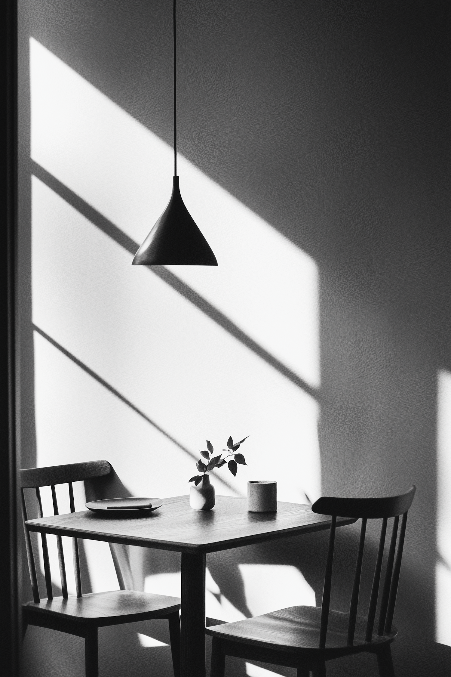 Minimalist black and white dining scene with wooden chairs, a small table, and a pendant lamp casting soft shadows.