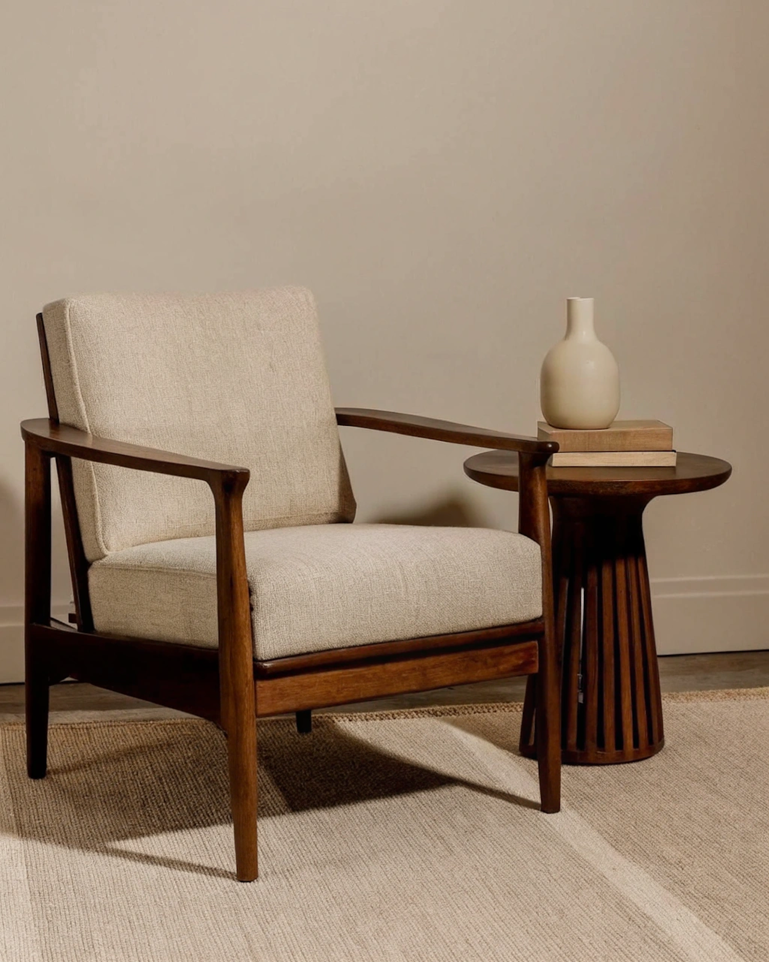 Mid-century modern armchair with beige cushions, paired with a wooden side table holding a vase and books, set on a woven rug.