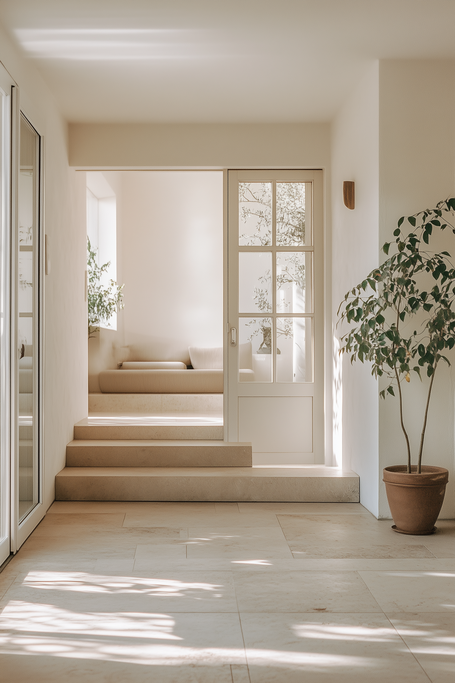 Minimalist interior with beige tones, glass doors, cozy seating, and lush greenery. Sunlight casts soft leaf shadows on stone tiles.