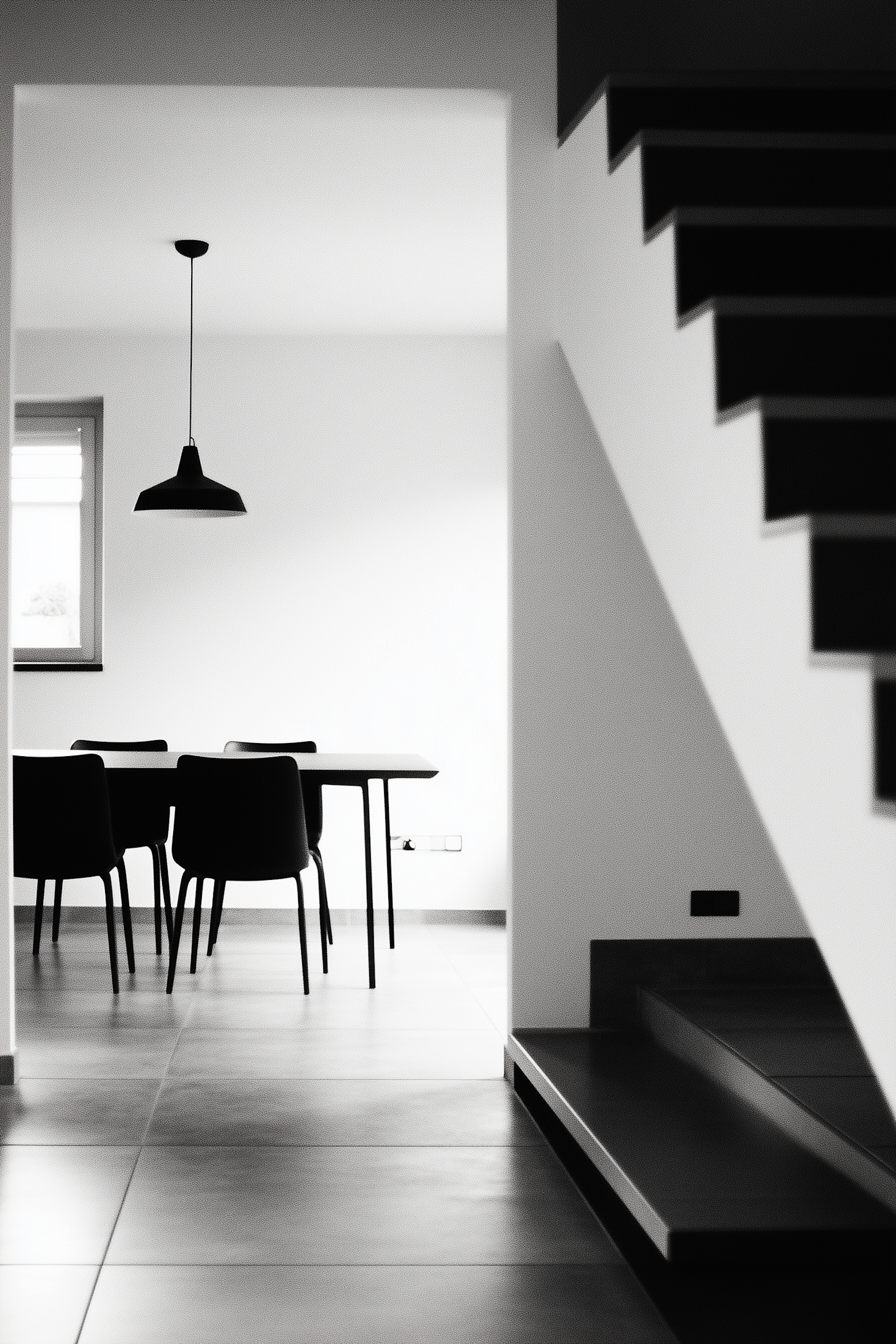 Minimalist black and white interior with modern dining set and staircase, featuring sleek design and natural lighting.