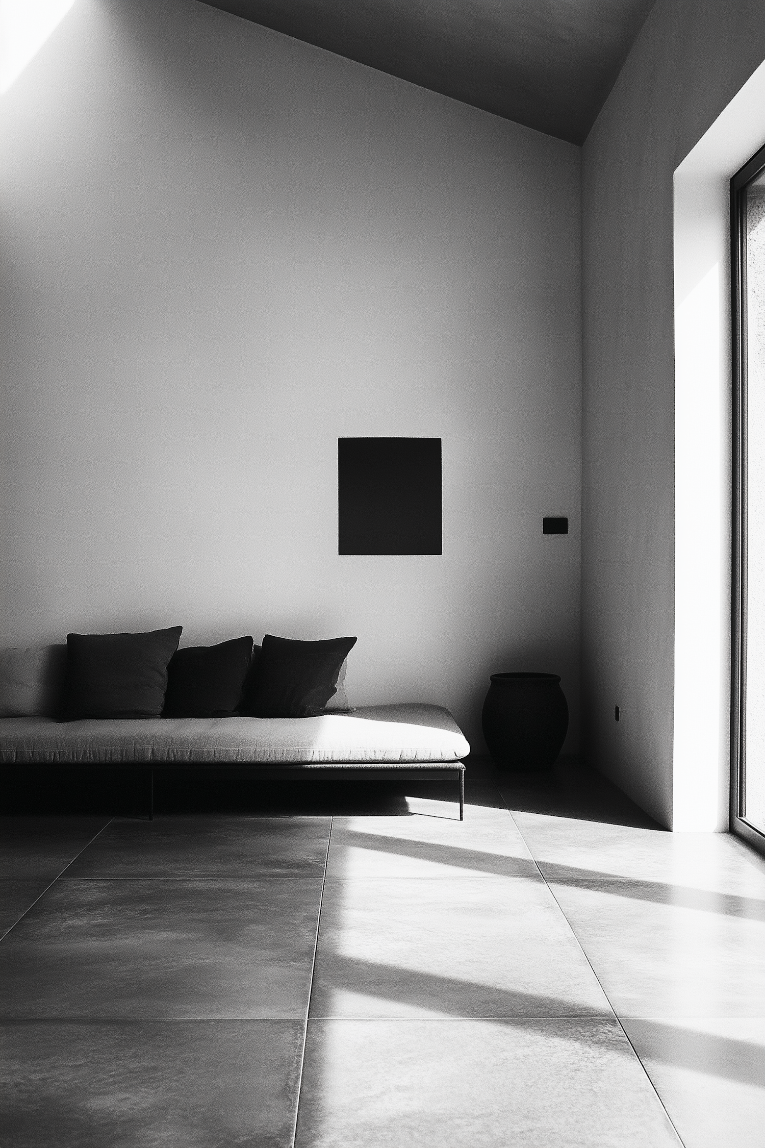 Minimalist interior with a sleek sofa, dark pillows, and a black wall panel. Natural light highlights the elegant simplicity.