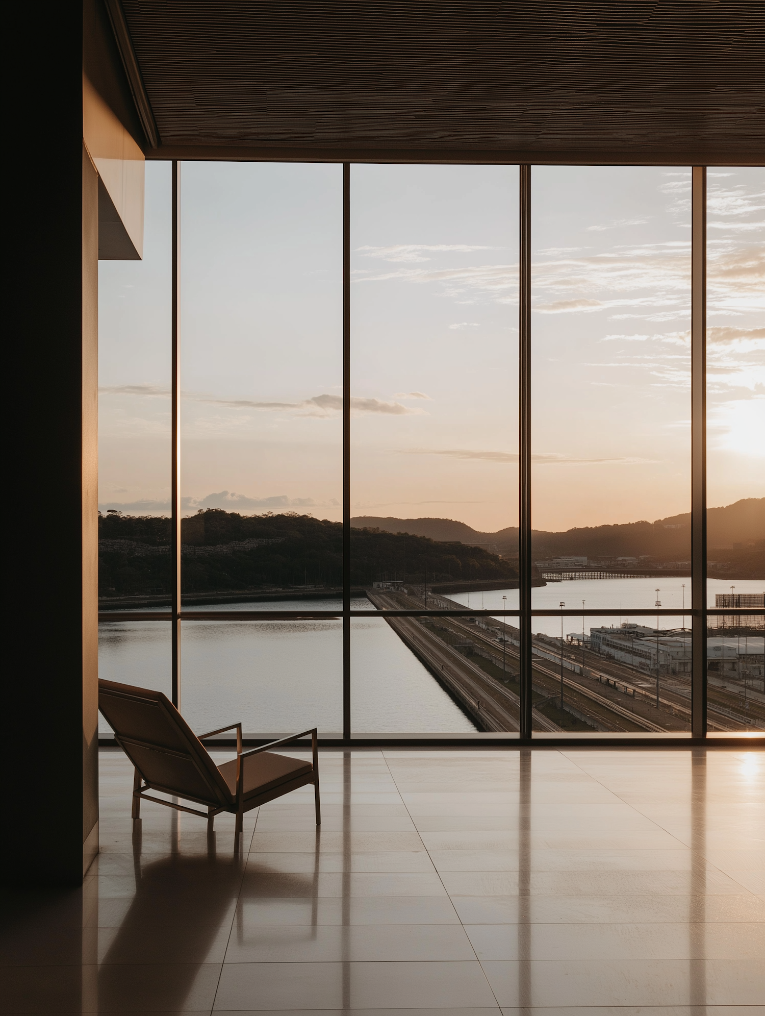 Minimalist interior with a modern chair by a floor-to-ceiling window overlooking a serene waterway and sunset-lit hills.