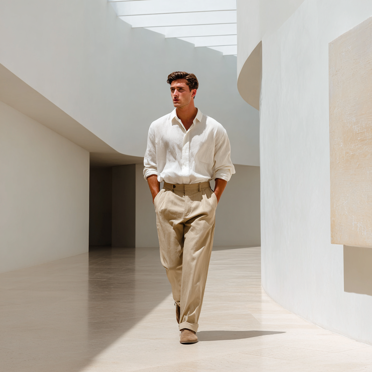 A man in a white shirt and beige trousers walks through a modern, minimalist interior with soft natural lighting and clean architectural lines.