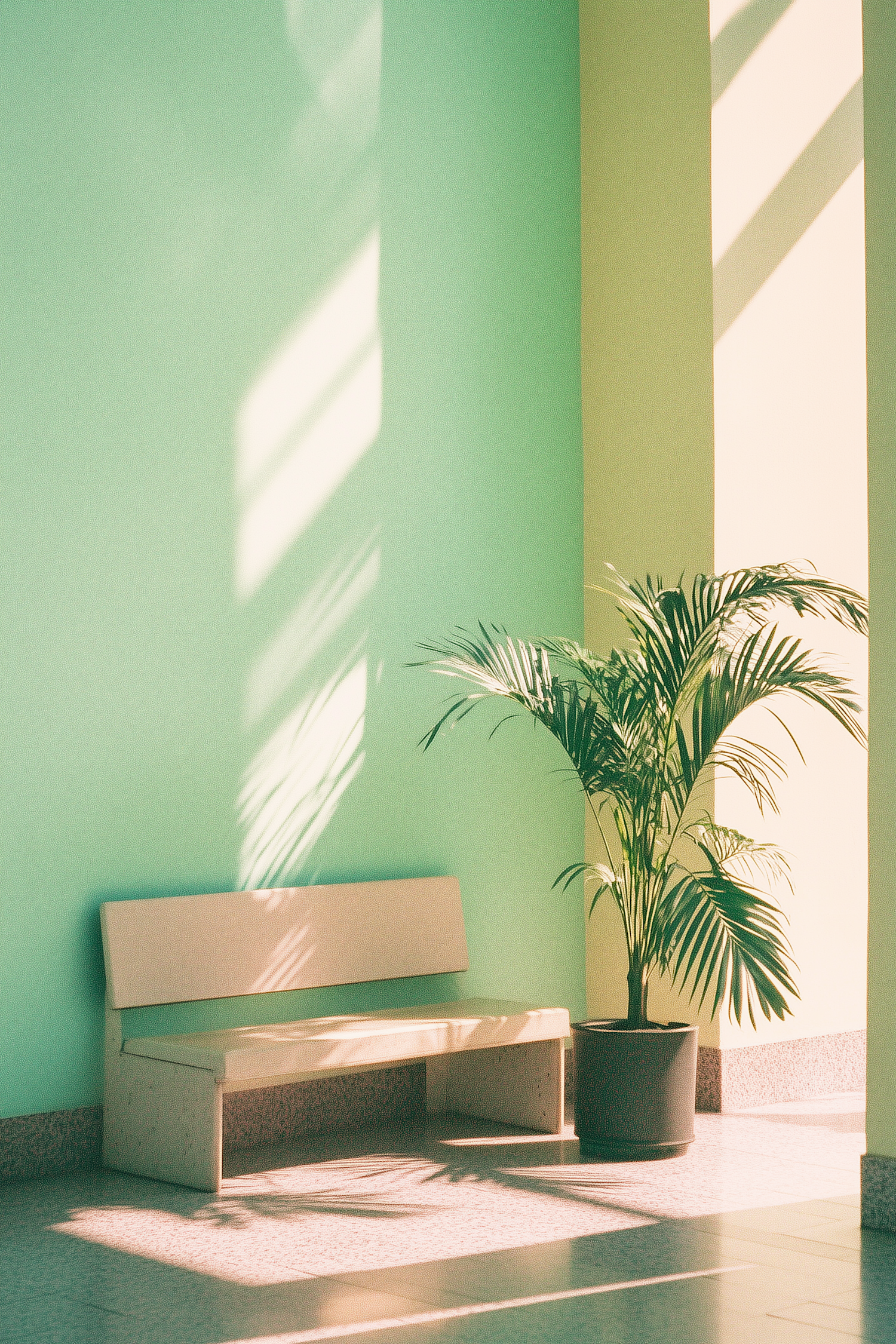Minimalist interior with a pale green wall, light bench, and lush potted plant. Soft natural light creates a serene atmosphere.