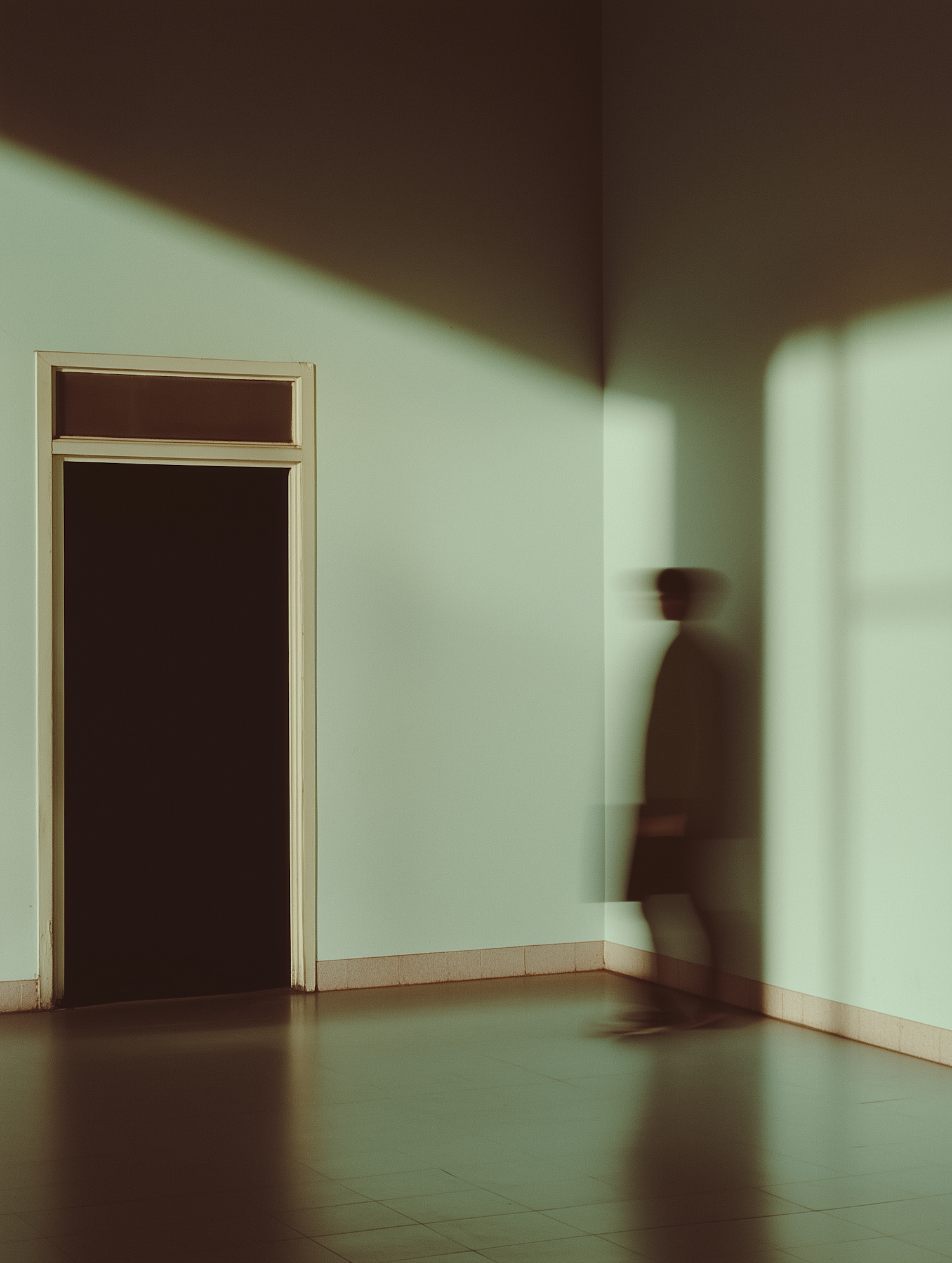 Minimalist interior with muted green walls, sharp shadows, and a blurred figure walking, evoking mystery and motion.