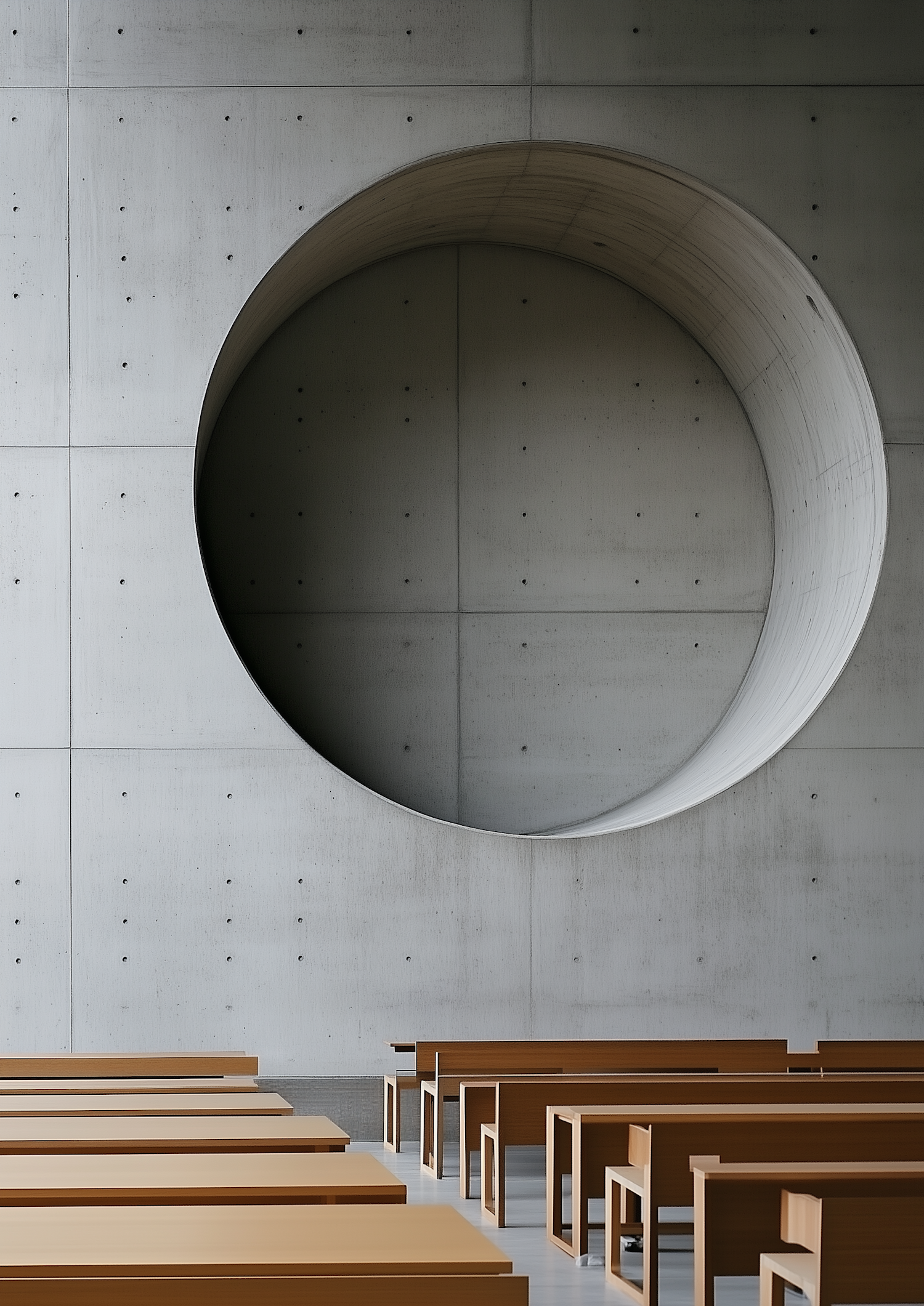 Minimalist interior with a circular cutout in a concrete wall, wooden benches, and modern industrial design elements.
