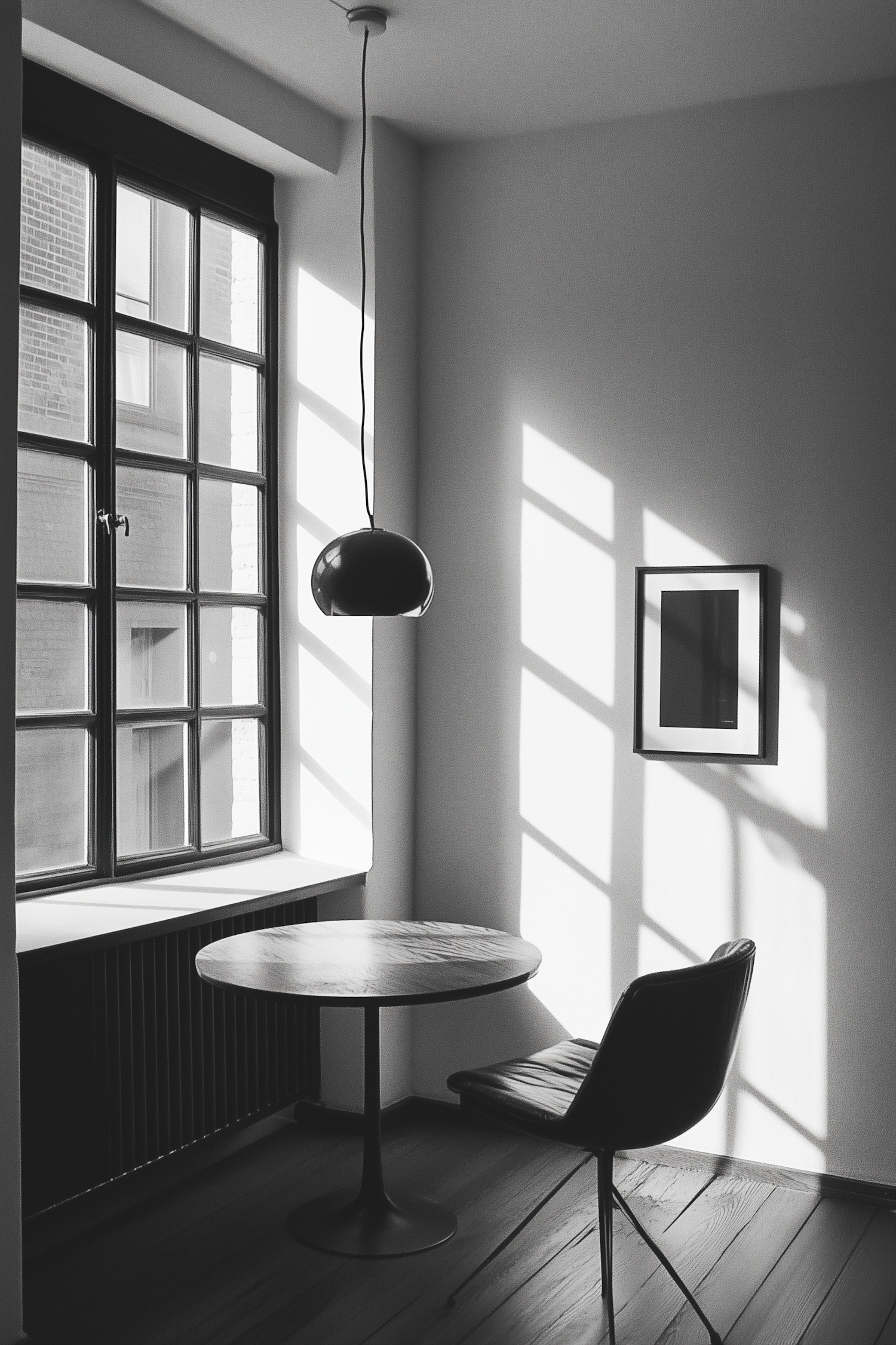 Minimalist room with geometric shadows, featuring a round table, black chair, pendant light, and abstract art on a white wall.