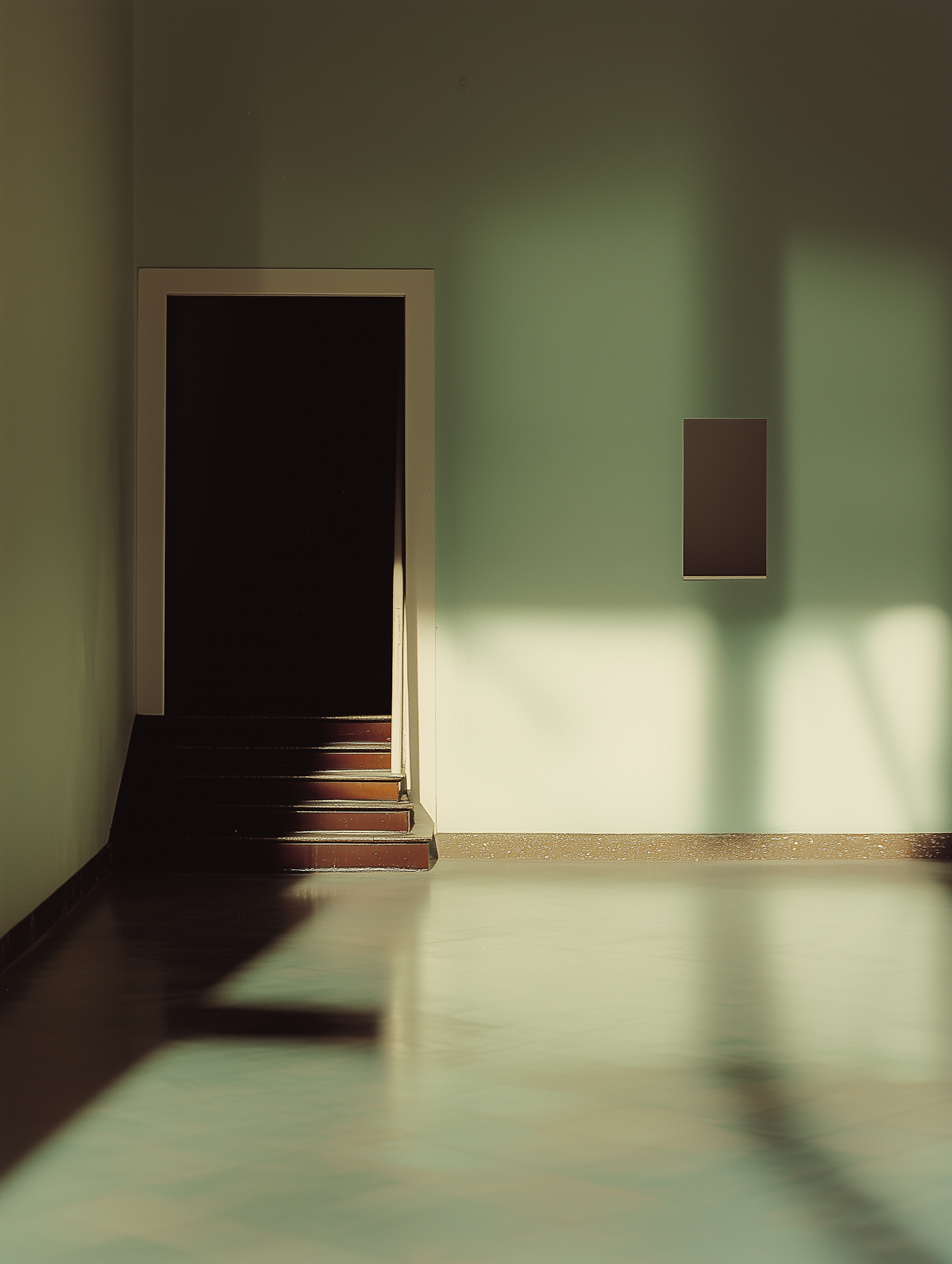 Minimalist interior with muted green walls, dark doorway, staircase, and soft light casting geometric shadows on a polished floor.