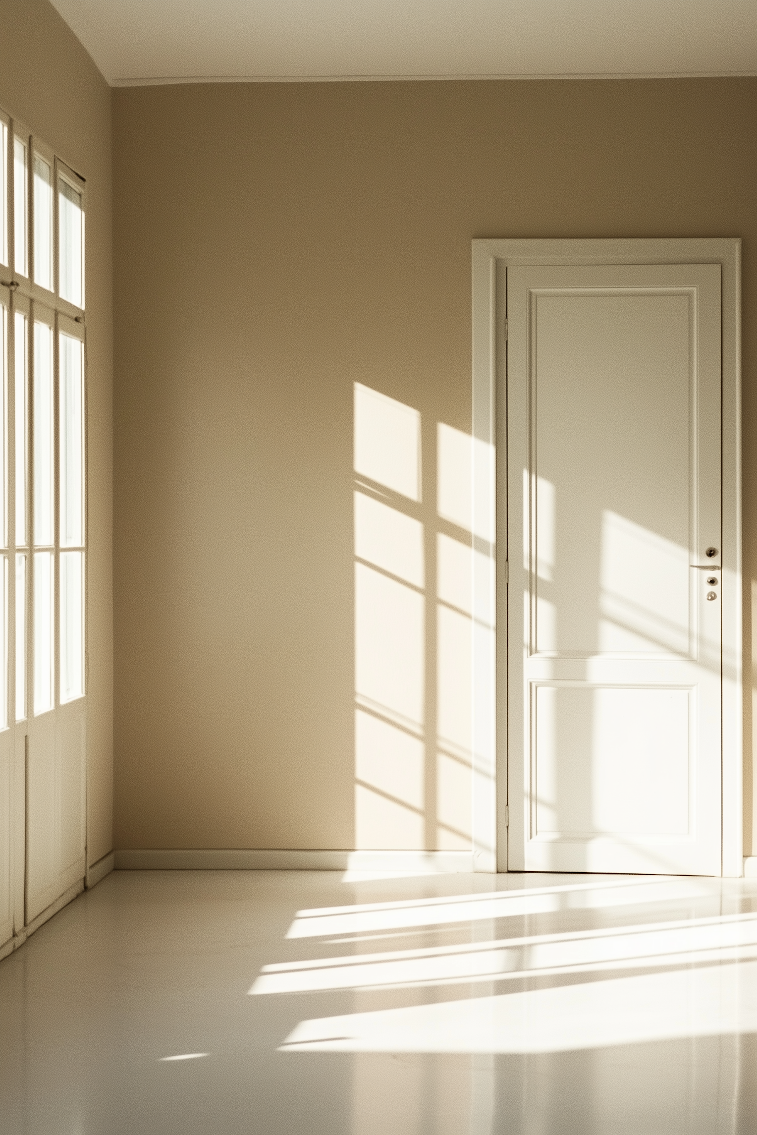 Minimalist room with beige walls, white door, and sunlight casting geometric shadows on the floor.