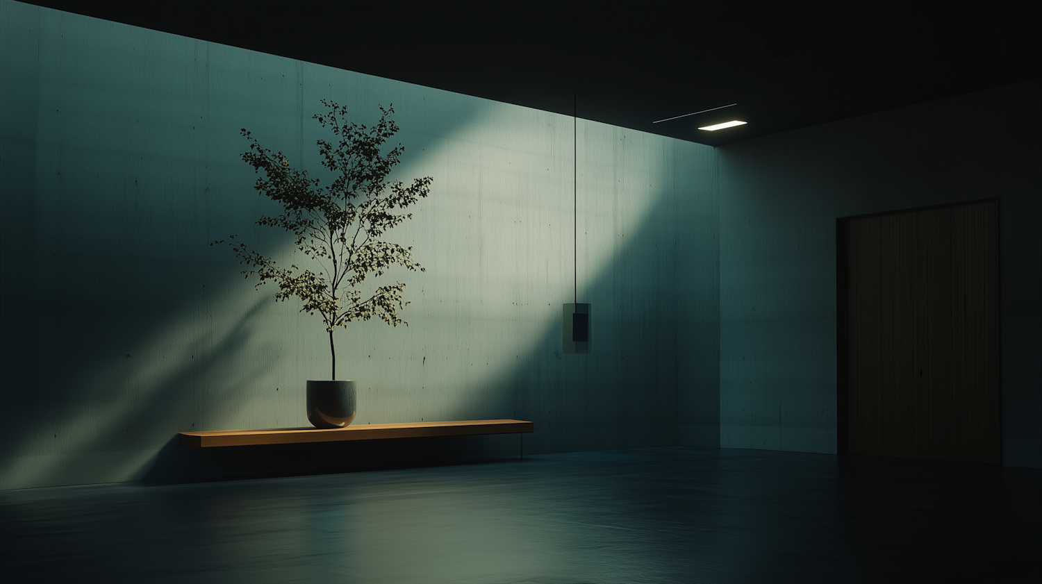 Minimalist room with a potted plant on a bench, dramatic lighting, and a sleek modern design.