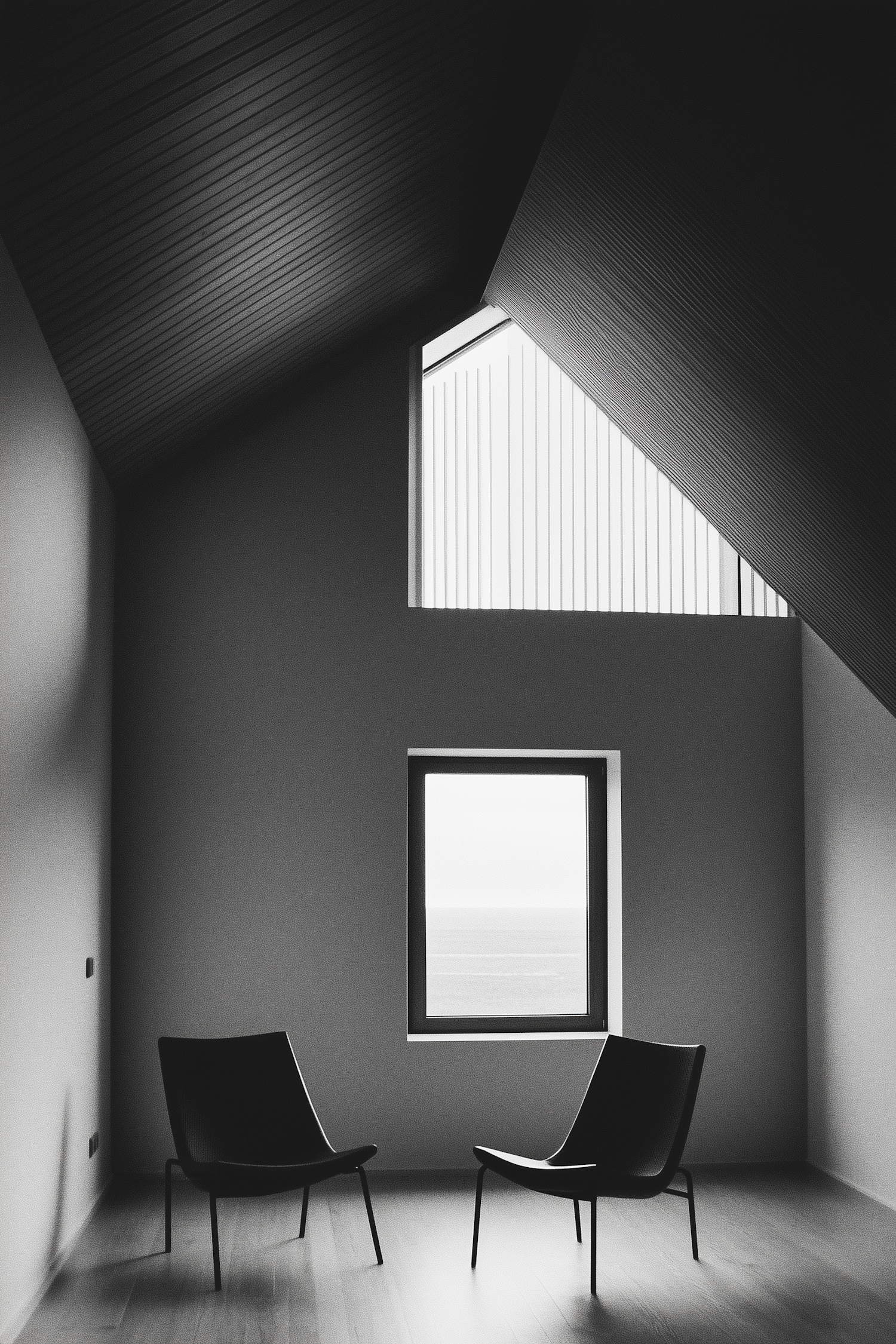 Minimalist room with two black chairs, large window with sea view, and high slanted ceilings. Monochrome palette enhances elegance.