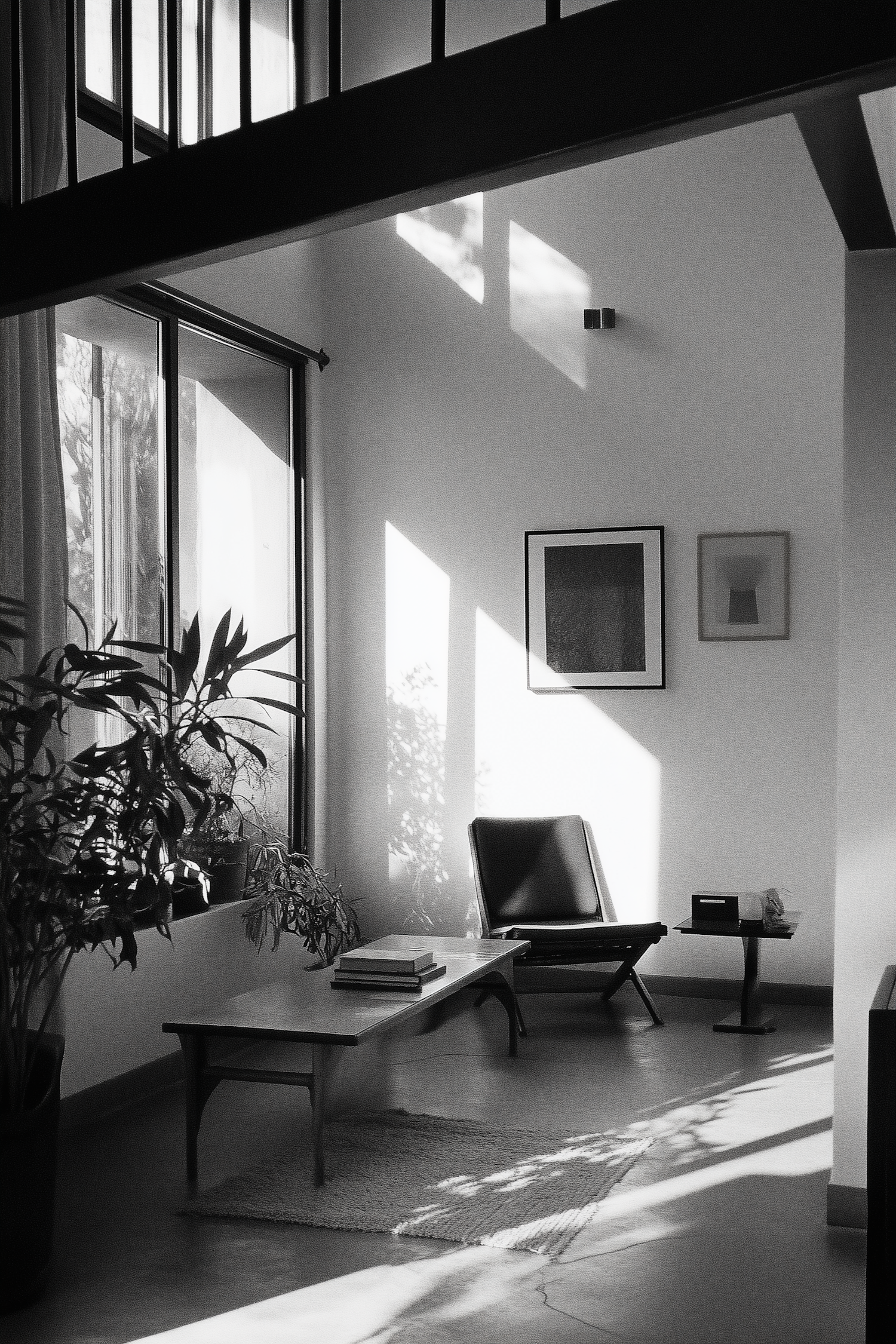 Minimalist living room with black leather chair, wooden coffee table, abstract art, and lush plants in natural light.
