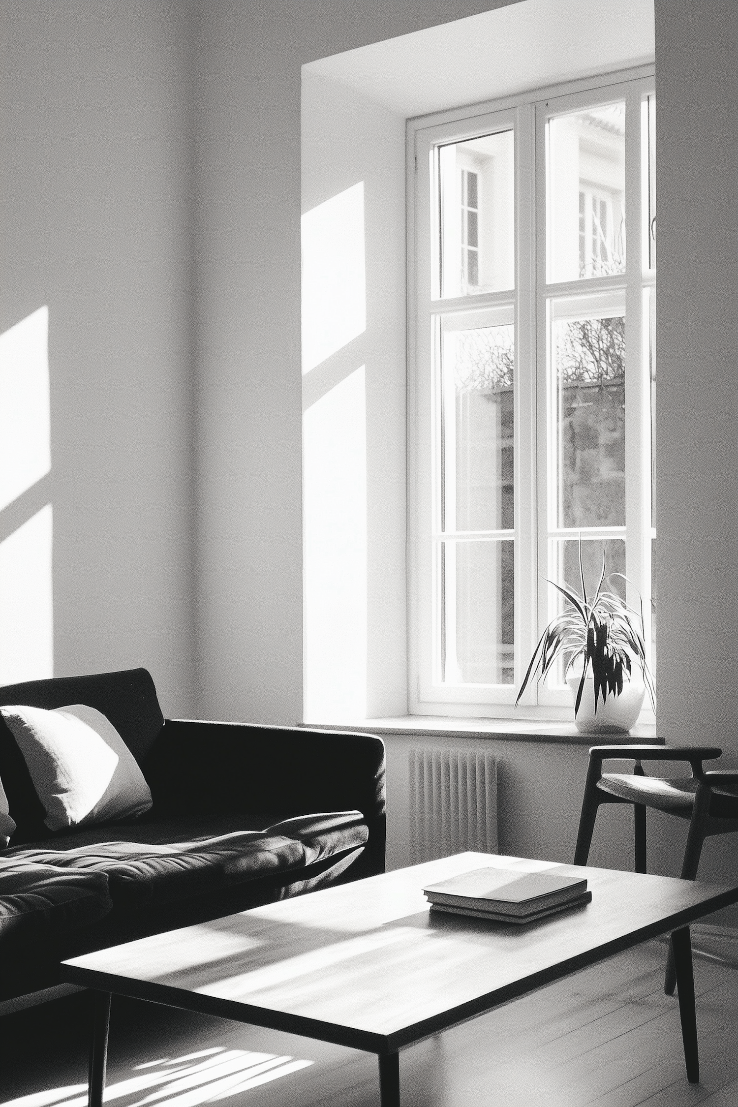 Minimalist living room with black sofa, wooden coffee table, and large window. Natural light and a potted plant create a serene atmosphere.