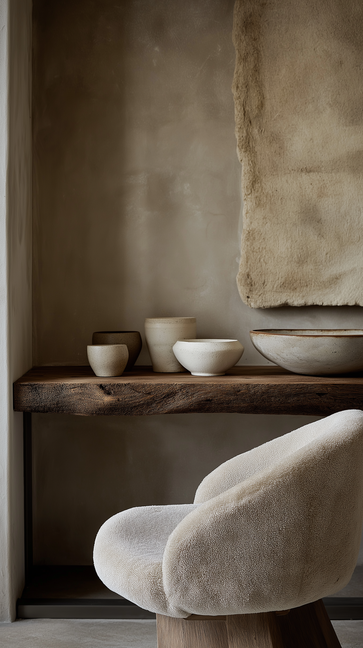 Minimalist interior with a cozy cream armchair, rustic wooden shelf, and elegant ceramic bowls in neutral tones.