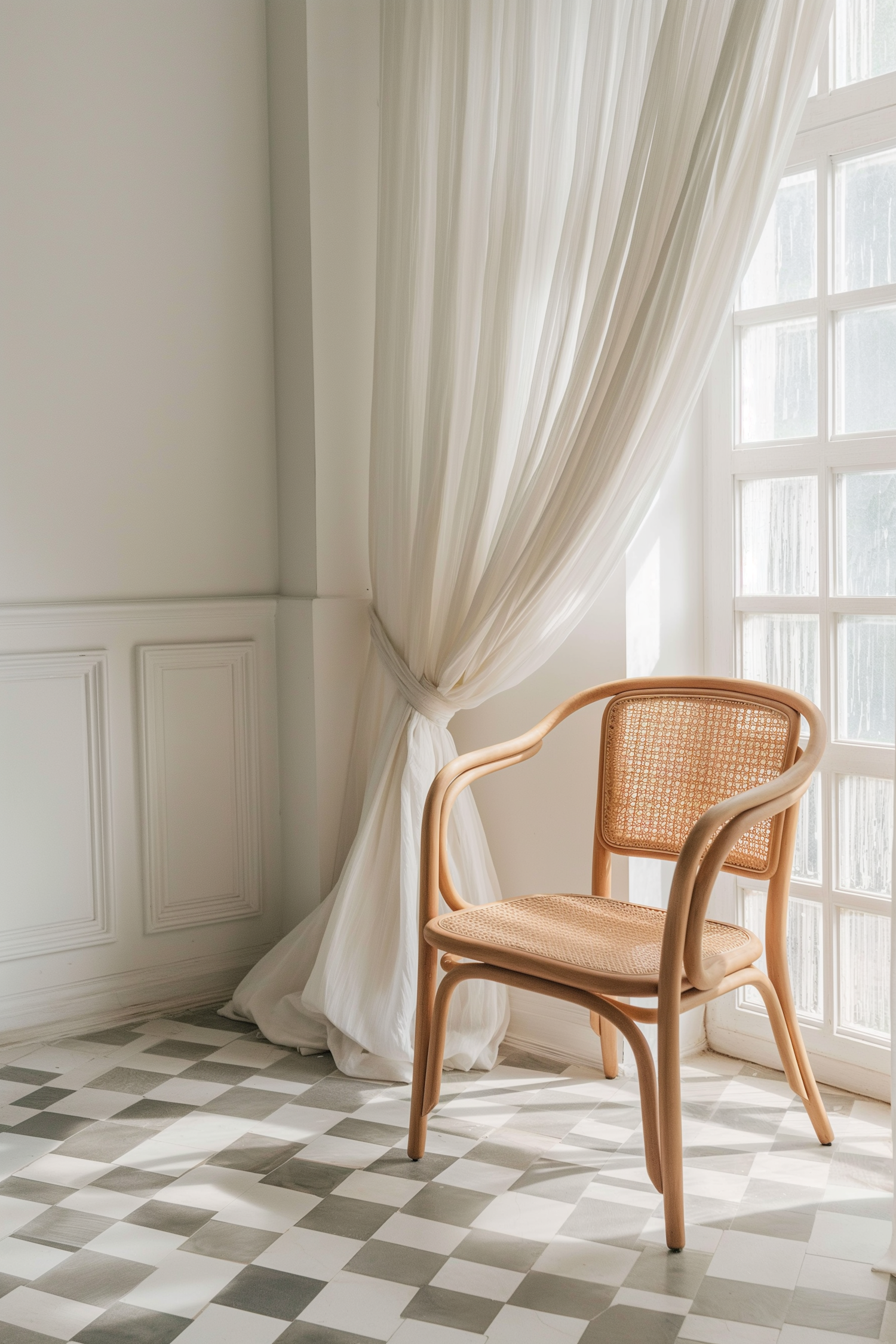 Minimalist interior with a wooden chair, sheer curtains, and checkered floor tiles. Sunlight streams through a large window, creating a serene ambiance.