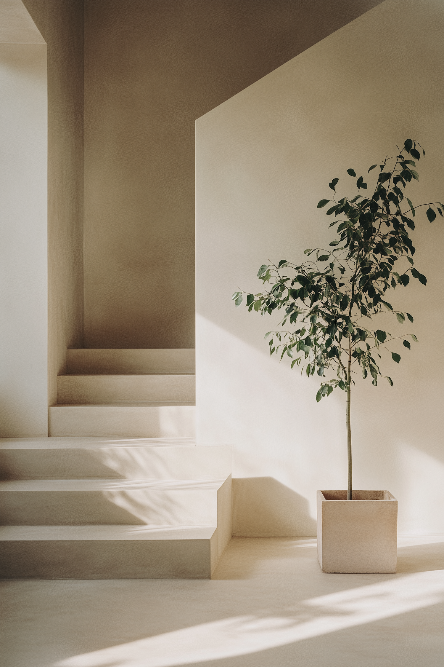 Minimalist interior with a staircase and a potted plant, featuring soft natural light and neutral tones for a serene atmosphere.