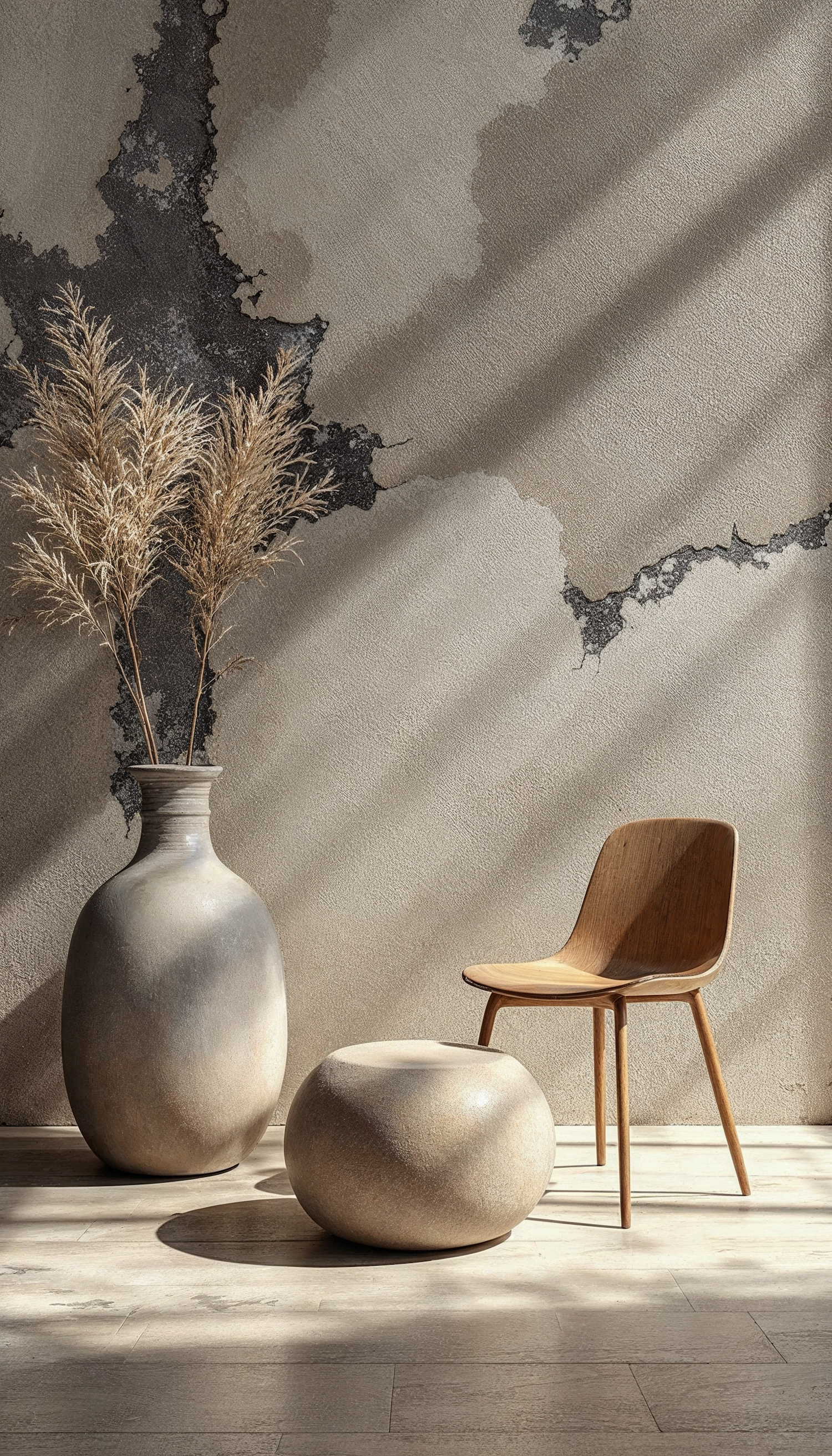 Minimalist interior with a large vase, pampas grass, stone ottoman, and wooden chair against a textured wall with sunlight patterns.