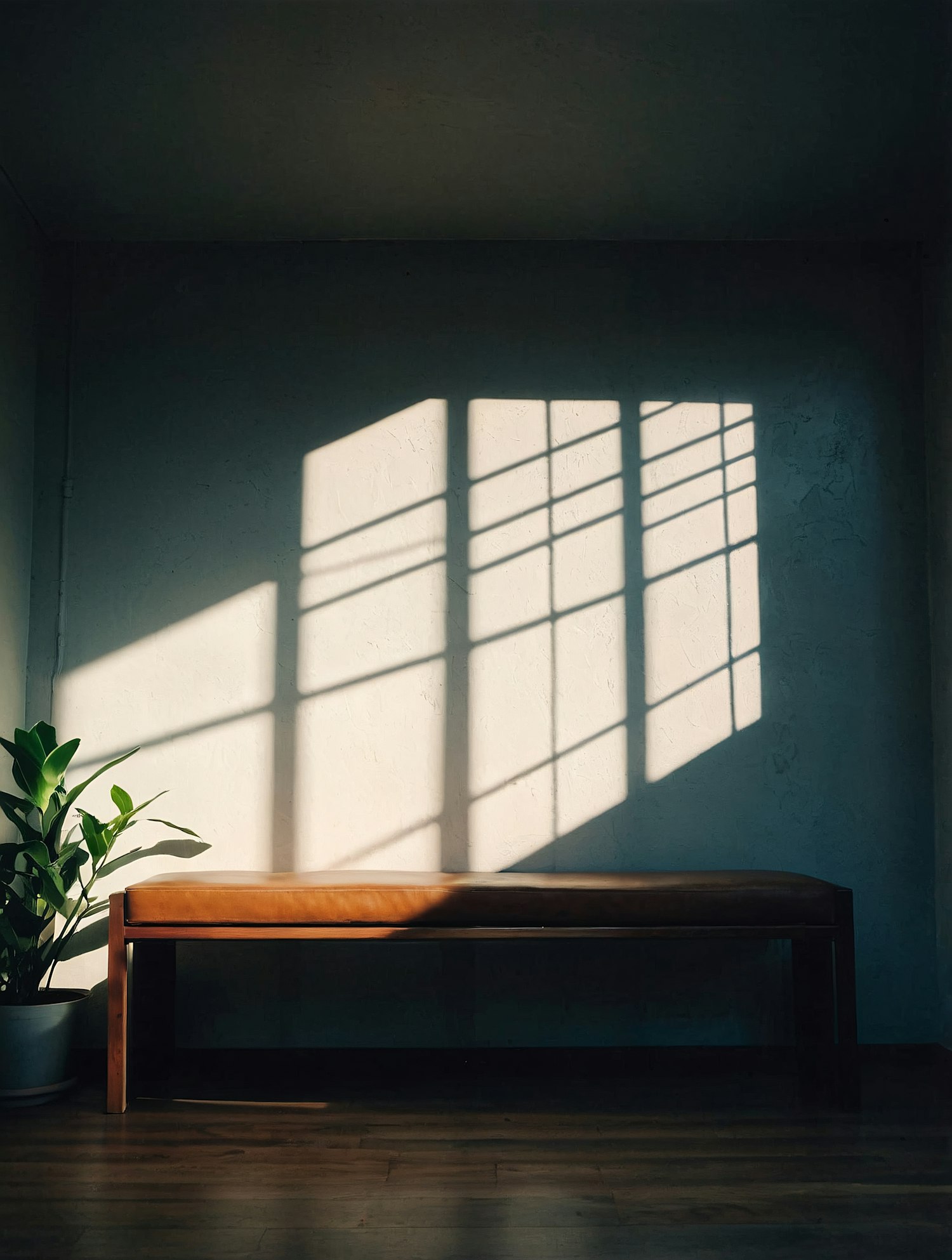 Minimalist room with a wooden bench, potted plant, and sunlight casting geometric shadows on the wall.