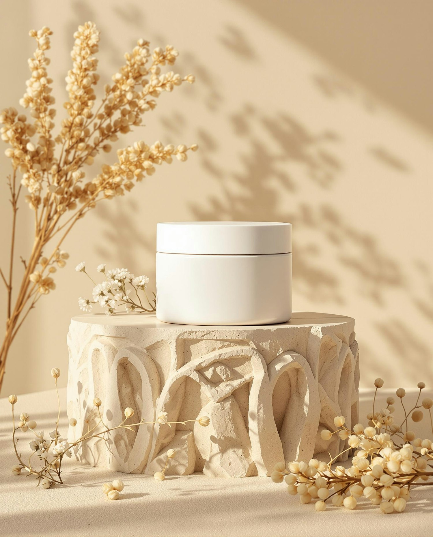 A beauty product mockup featuring a blank white cylindrical jar (cosmetic cream style) standing on a carved stone pedestal surrounded by natural textures: dried flowers, small branches, and textured sand. The lighting is diffused and soft, evoking a sunrise feel. The backdrop is a neutral beige with subtle gradients. The jar is matte, with no reflection and no writing. The whole image should feel organic, artisanal, and high-end.
