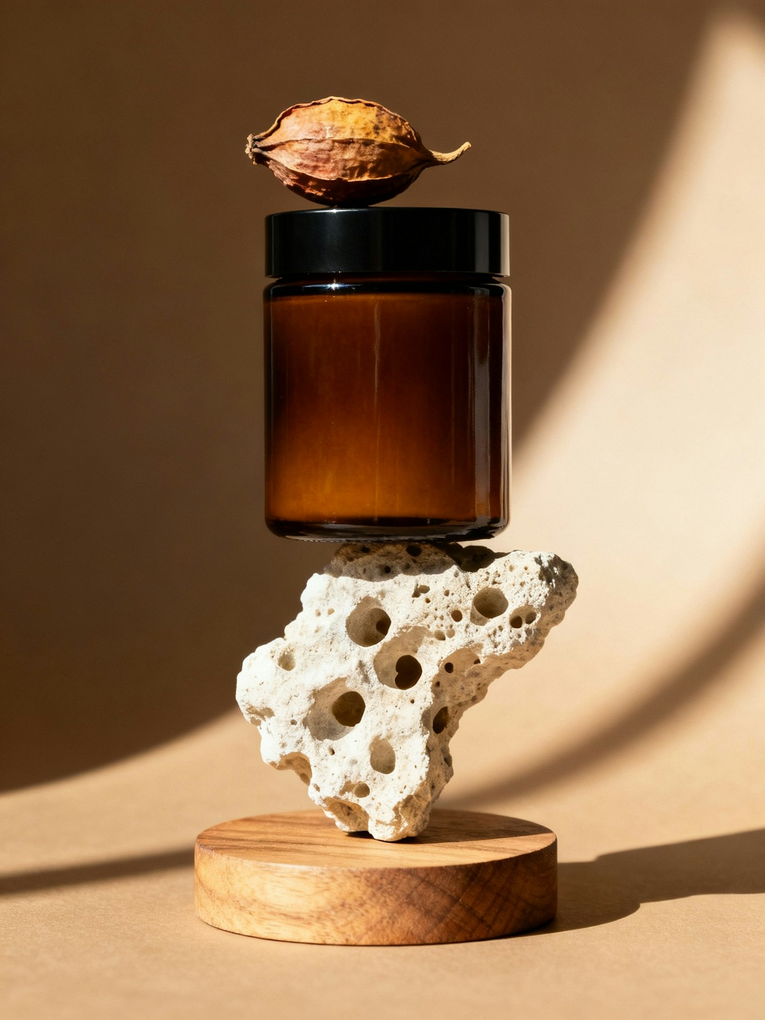 Studio product photography in a refined, sculptural, and organic art direction — matte amber glass packaging with a black lid, minimalist and label-free, placed against a warm brown studio background. The lighting is soft, directional, and diffused from one side, creating gentle shadows and a natural sense of depth. The overall atmosphere is earthy and calm, with warm tones, tactile textures, and a poetic balance between raw materials and crafted elegance. Style inspired by high-end skincare campaigns — natural sophistication, sensory minimalism, and sculptural composition. A larger amber jar sitting atop a sculptural base made of stacked objects — a rounded wooden disc, a porous limestone fragment, and a piece of dried fruit or seed pod delicately balanced at the top. The setup feels like a poetic sculpture.