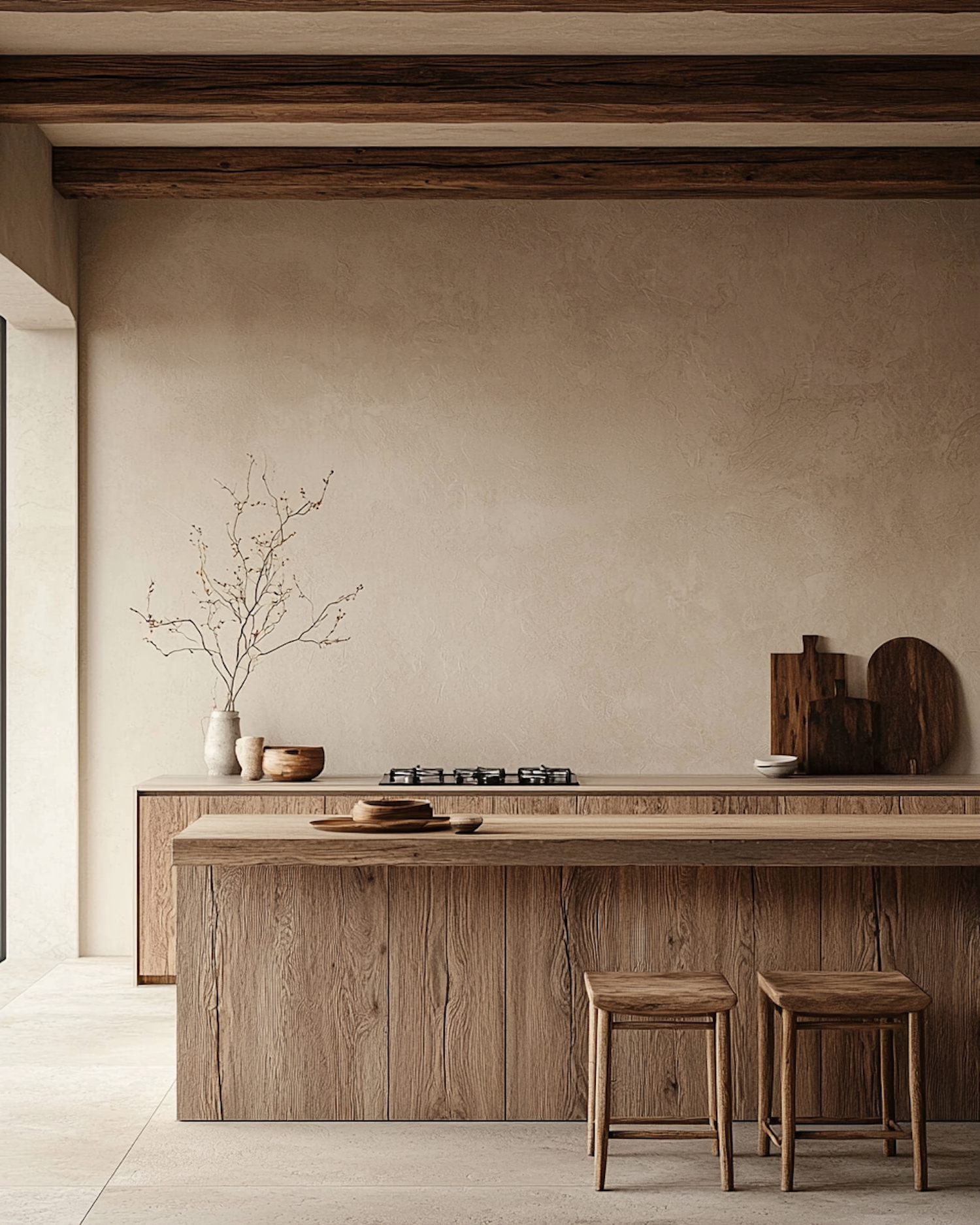Minimalist kitchen with a wooden island, stools, and earthy decor. Features natural textures, beige walls, and rustic wooden beams.
