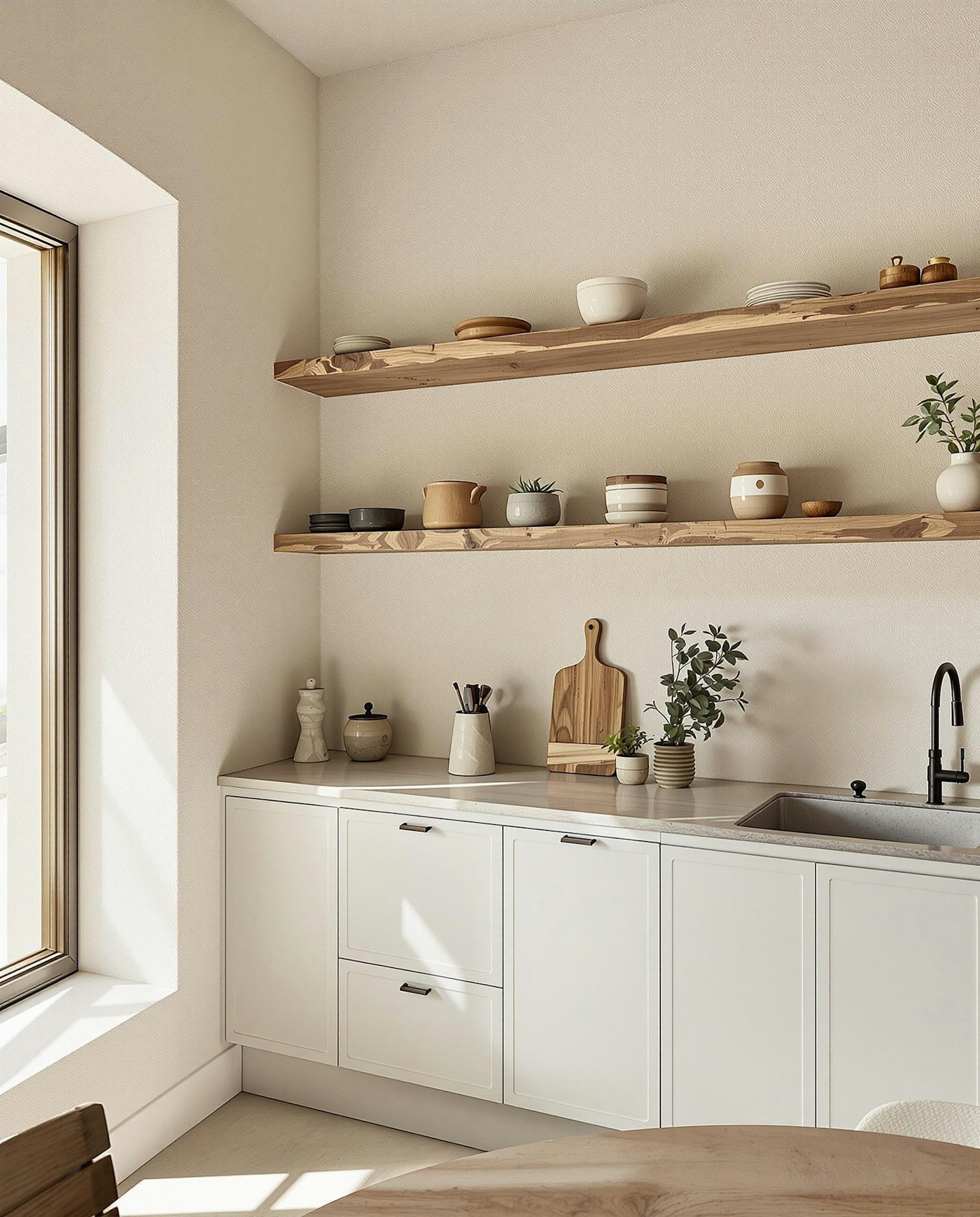 Minimalist kitchen with white cabinets, wooden shelves, ceramic decor, and a black faucet. Sunlight adds warmth to the cozy, modern space.
