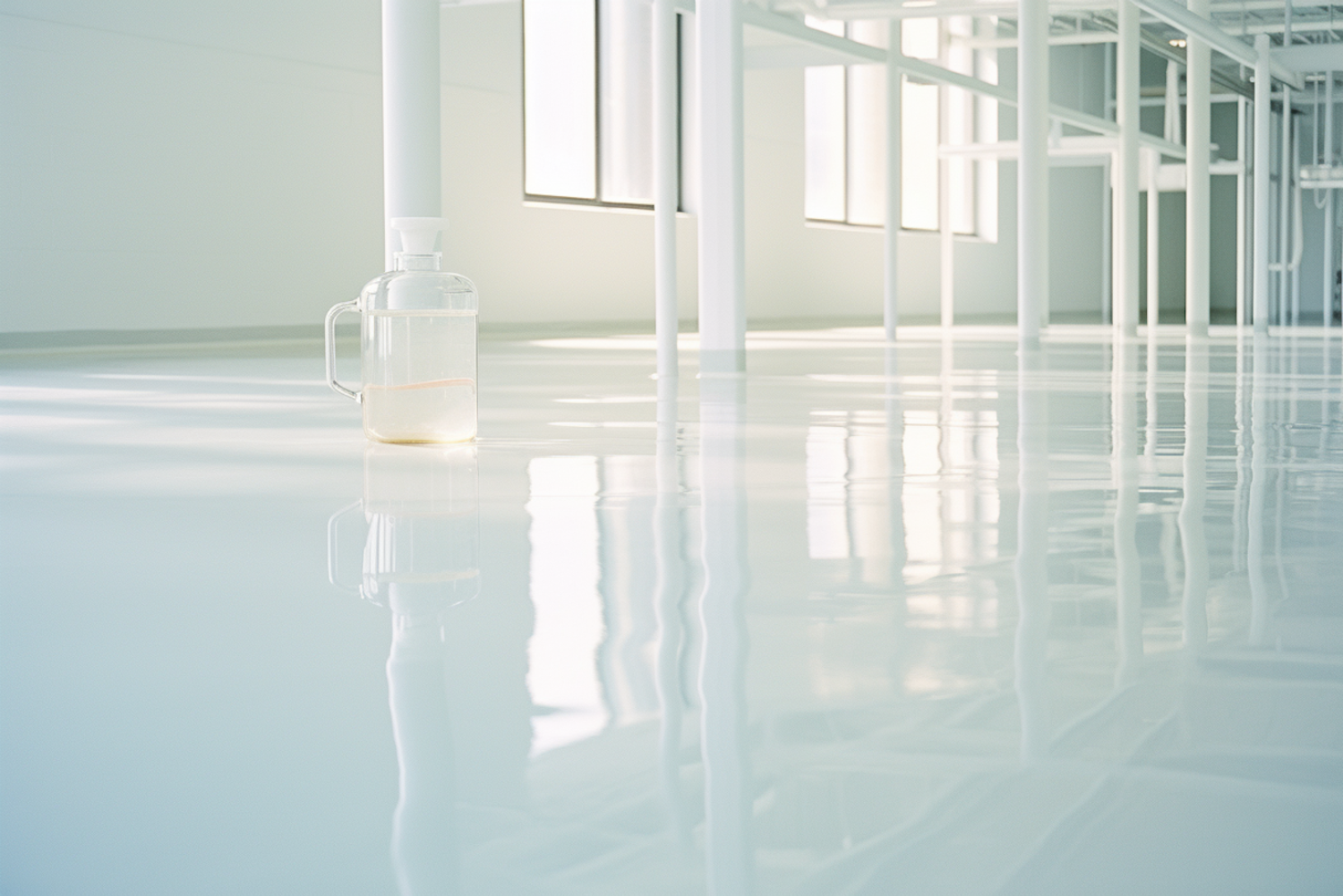 Minimalist room with polished floor, glass jug, and natural light streaming through large windows.