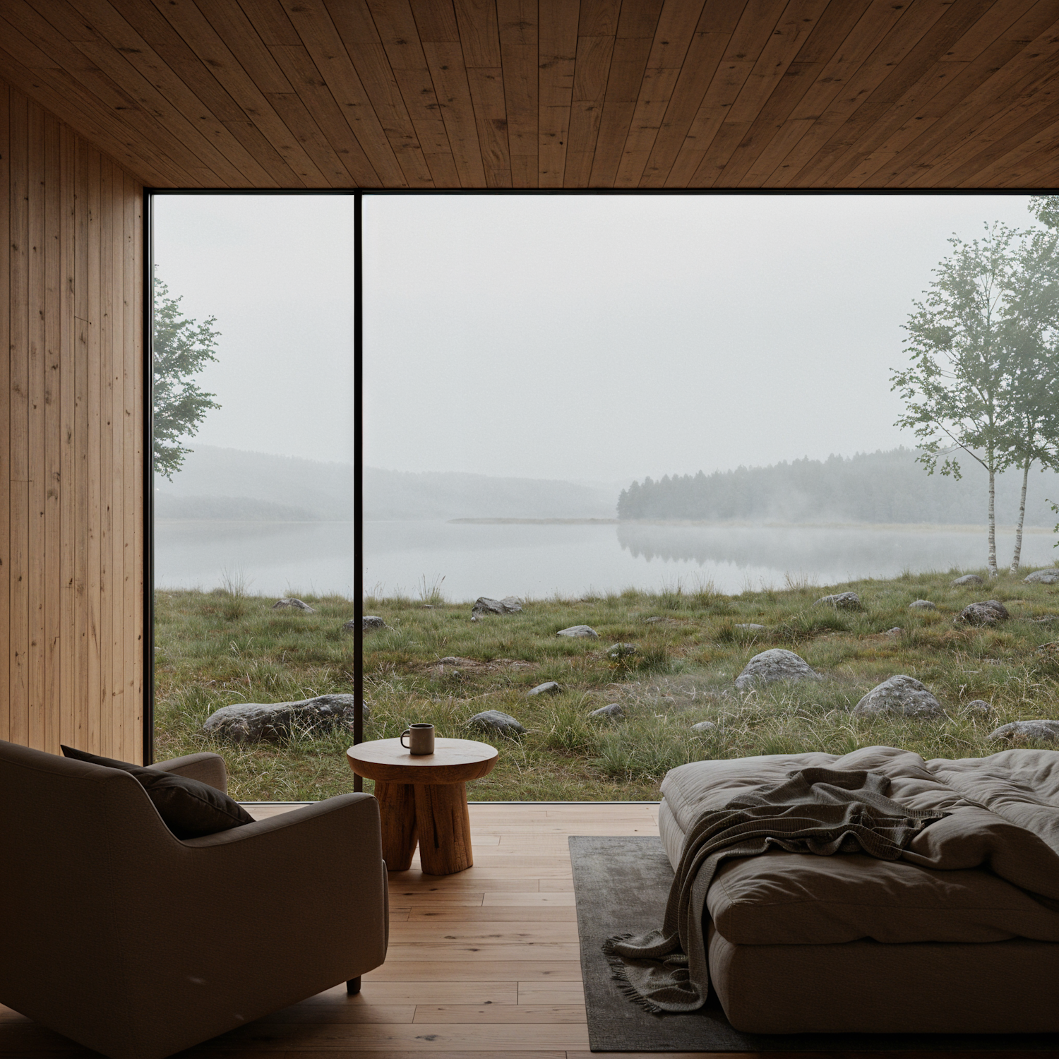 Minimalist lakeside room with cozy armchair, wooden table, and bed, overlooking a misty lake through a large glass window.