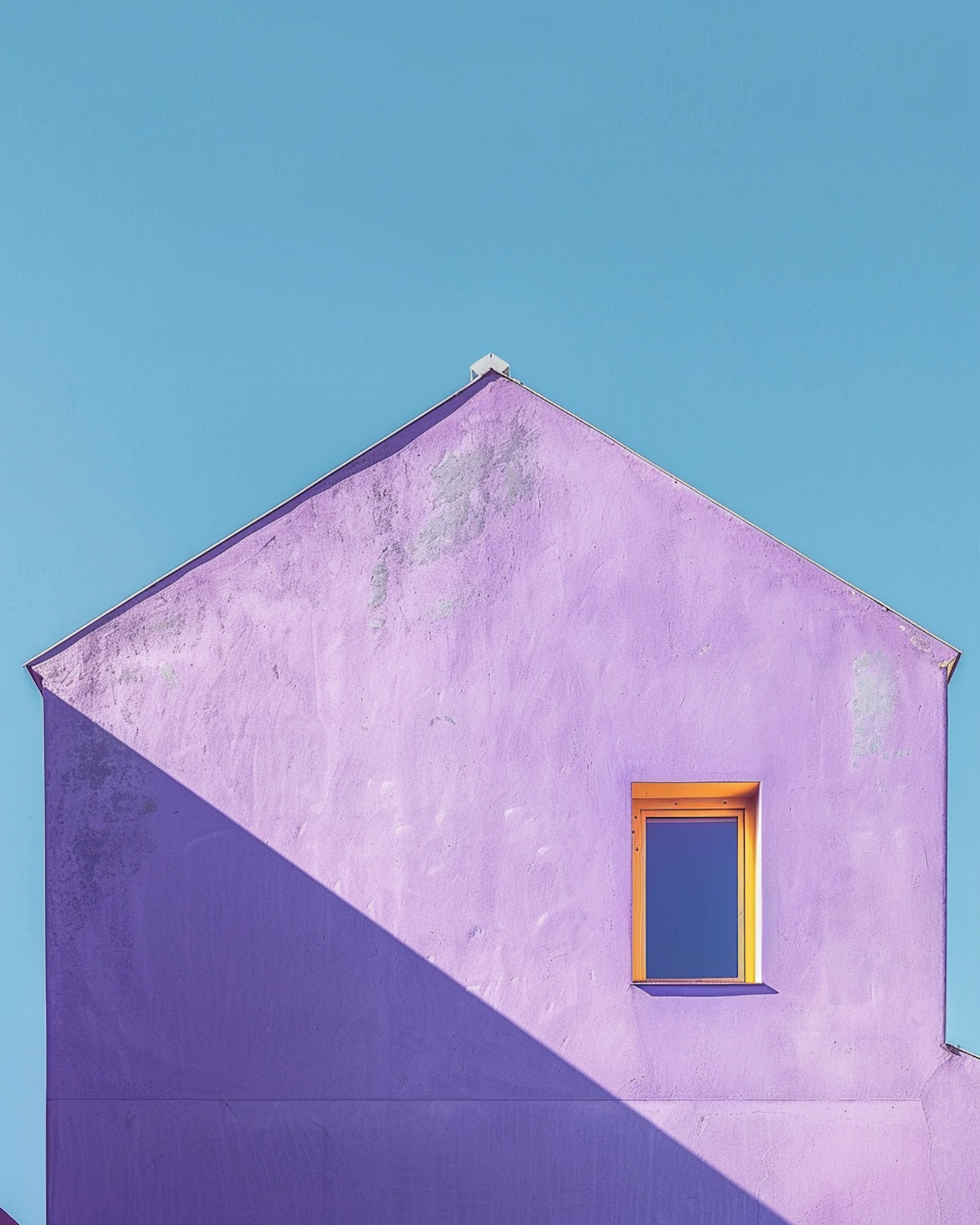 Minimalist purple house with orange window frame against a clear blue sky, featuring bold color contrasts and geometric shapes.