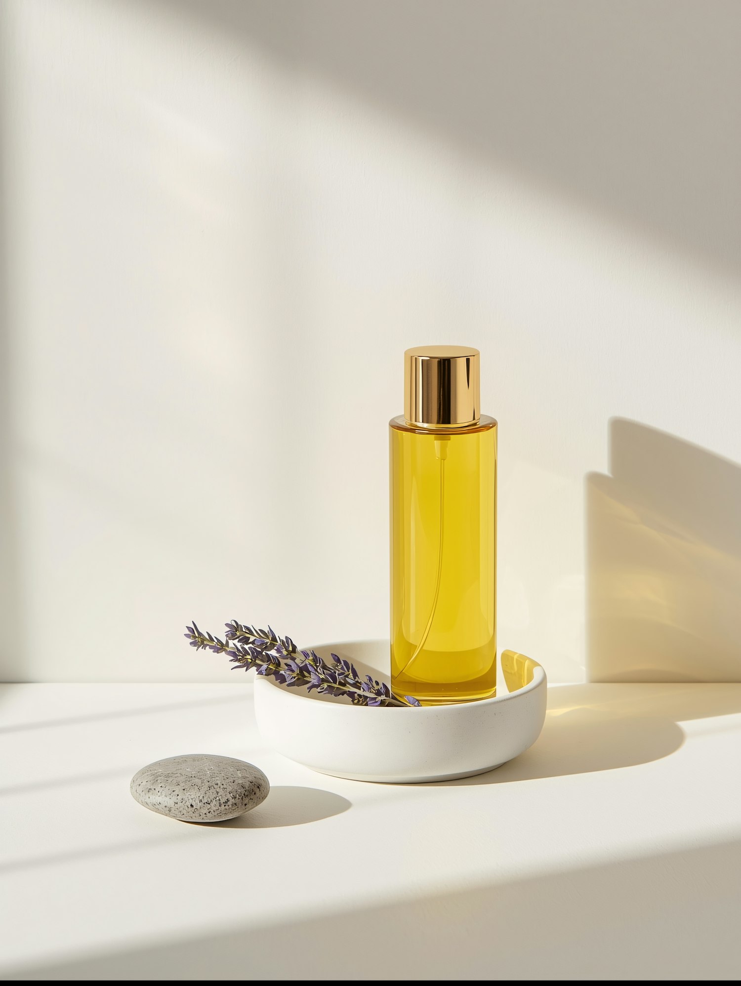 Elegant golden bottle with lavender and stone on a white surface, bathed in soft natural light for a minimalist aesthetic.