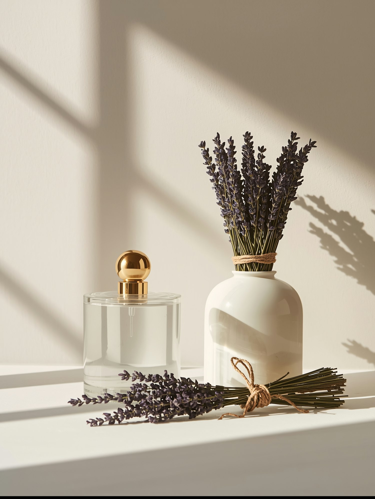 Minimalist setup with a perfume bottle, lavender in a vase, and soft natural light casting shadows on a beige background.