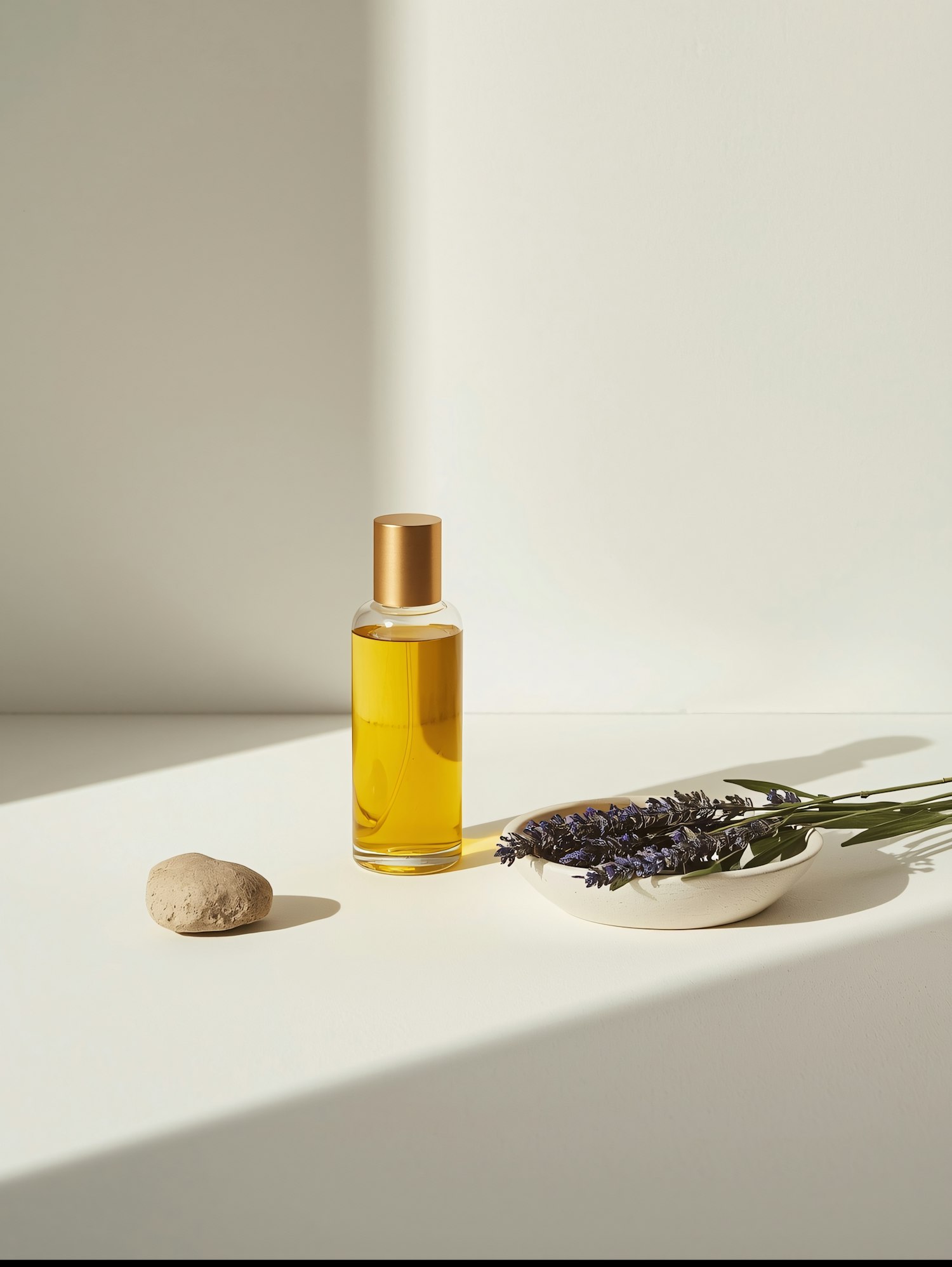 Minimalist setup with a golden oil bottle, lavender sprigs, and a stone on a white surface, bathed in soft natural light.