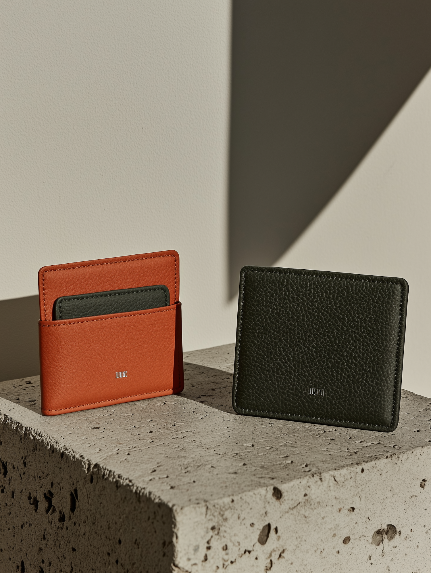 Minimalist orange and green leather wallets on a concrete surface, showcasing sleek design and textured details in sharp lighting.