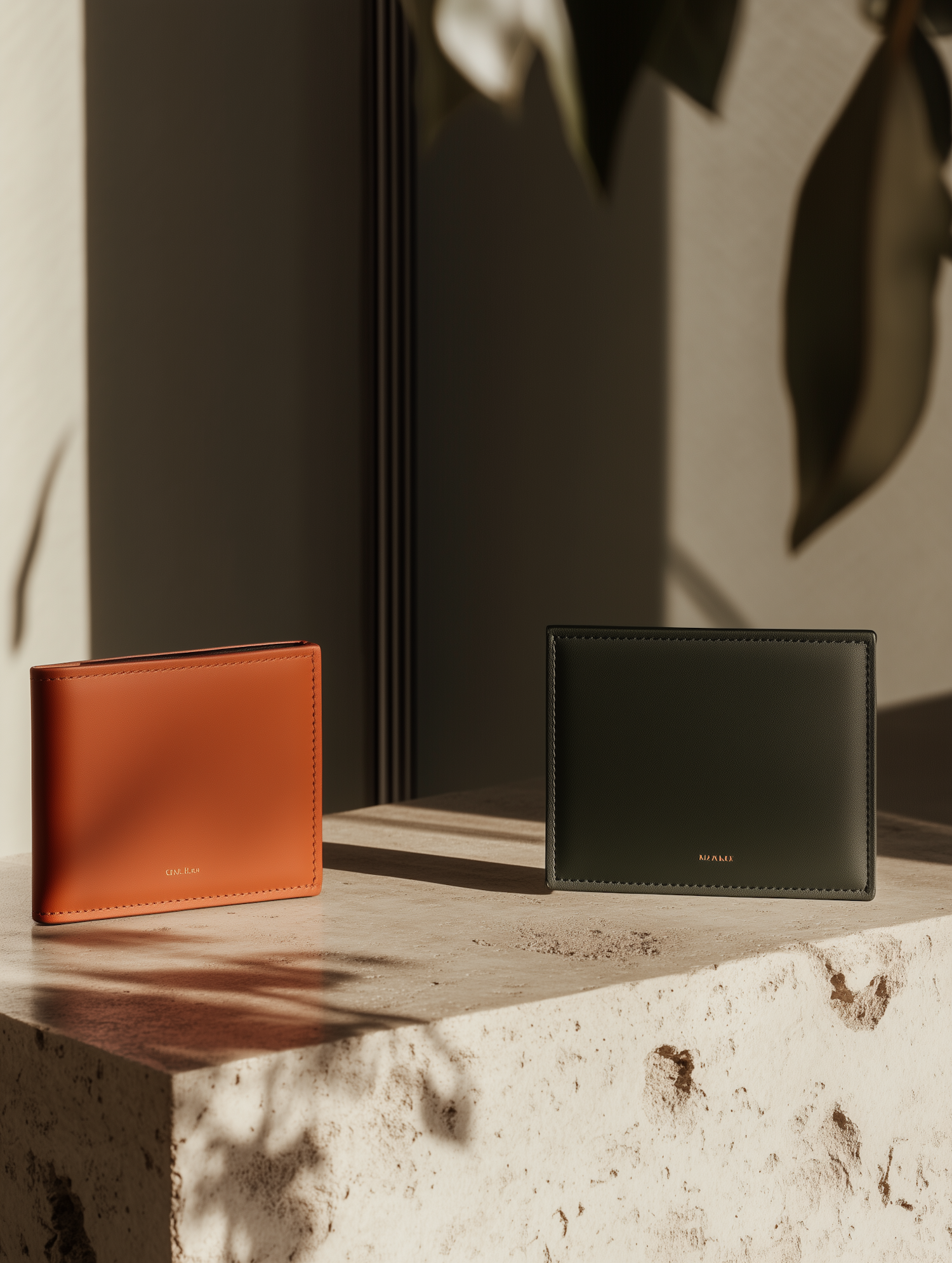 Minimalist orange and green leather wallets on a stone surface with soft lighting and leaf shadows, showcasing premium craftsmanship.